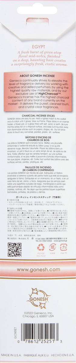 The best incense. Egypt: A fresh burst of green atop floral mid-notes, finished on a deep, haunting base creates a surprisingly fresh, exotic aroma. About Gonesh incense: Genieco continually strives t…