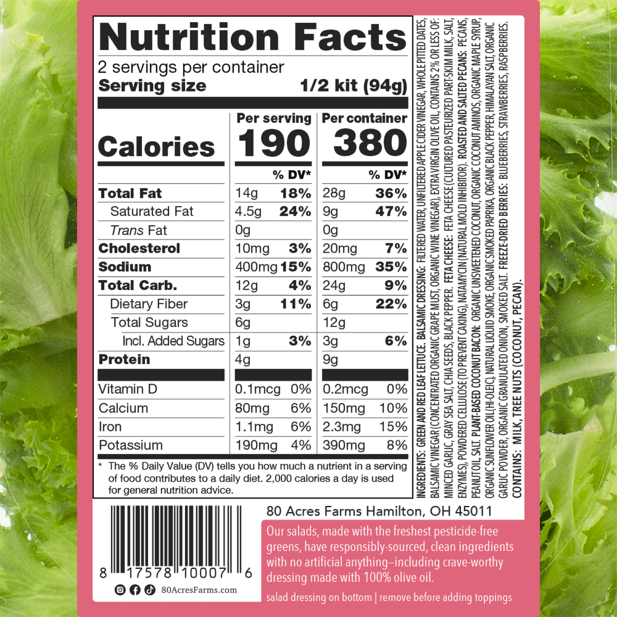 Green Leaf Lettuce, Red Leaf Lettuce, Balsamic Vinaigrette, Feta Cheese, Roasted & Salted Pecans, Plant Based Bacon, Freezed Dried Berries