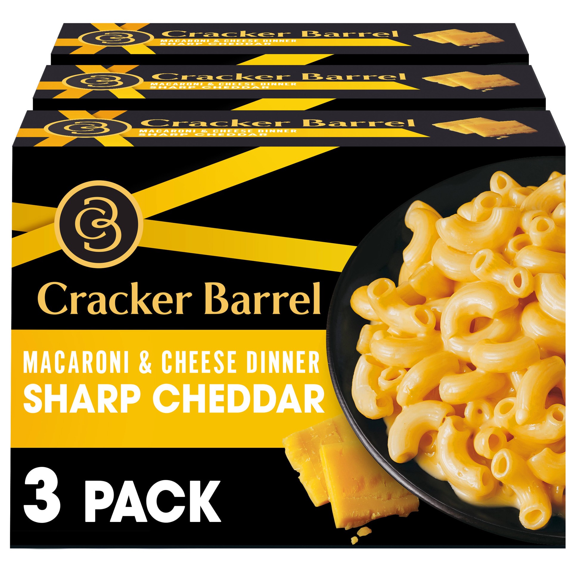 - CRACKER BARREL MAC AND CHEESE: Three 14 oz boxes of Cracker Barrel Sharp Cheddar Macaroni and Cheese Dinner