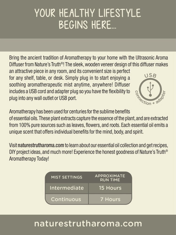 The sleek, wooden veneer design makes an attractive piece in any room. Its convenient size is perfect for any shelf, table, or desk. Simply plug in to any USB port to start enjoying a soothing aromath…