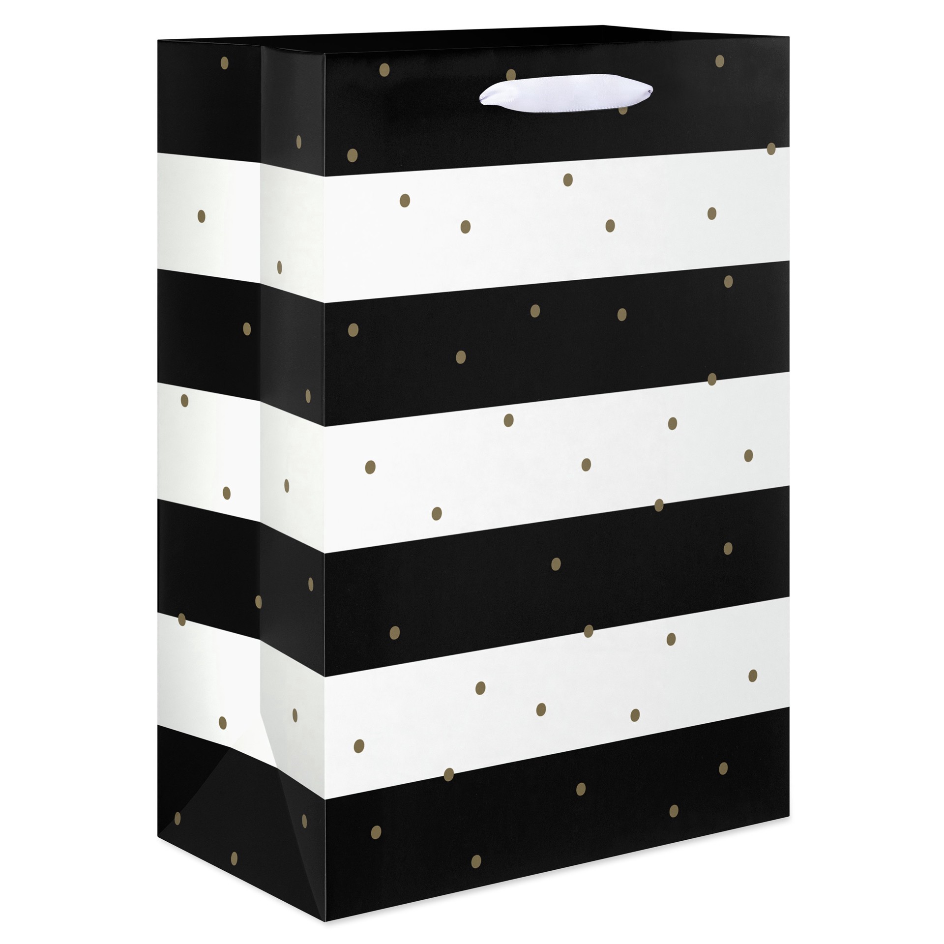 Give more than just an amazing present with this medium gift bag! This design features white and black stripes and gold dots with a satin ribbon handle. Medium gift bags are perfect for wrapping speci…