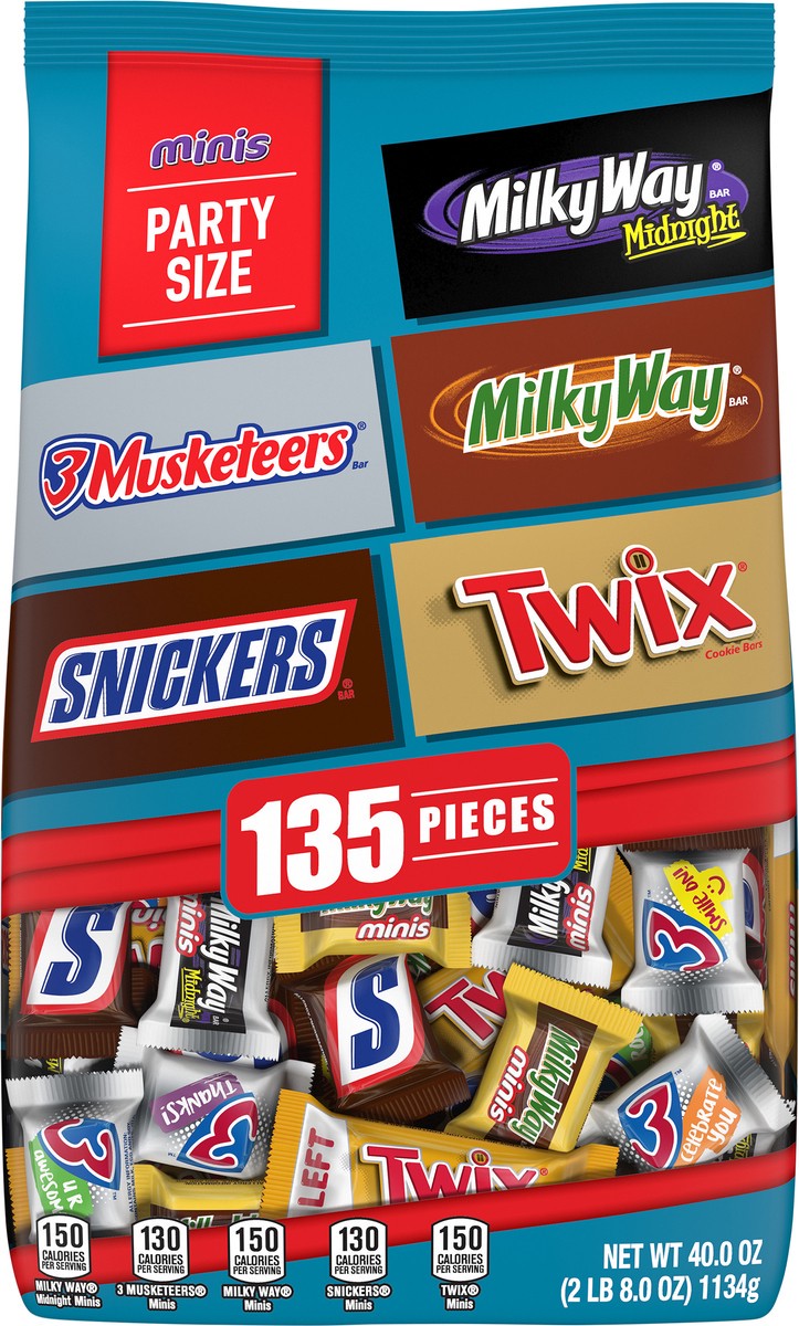 Featuring SNICKERS, TWIX, 3 MUSKETEERS, MILKY WAY Original and MILKY WAY Midnight Candy, this 40-ounce bag of MARS Chocolate Bars is a perfect way to always have a gift, surprise treat or chocolate sn…