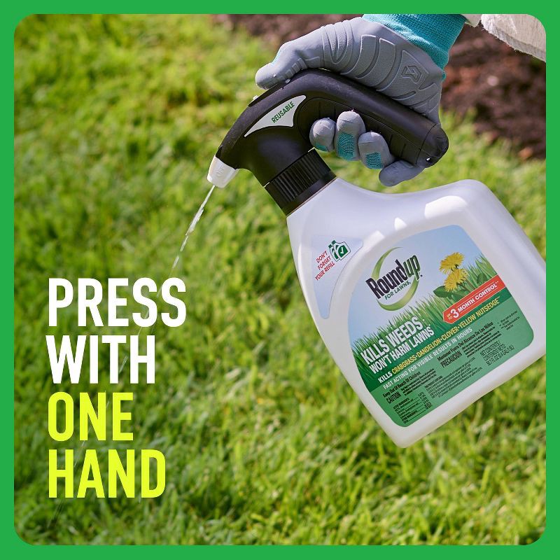 - Roundup® For Lawns1 is a ready-to-use tough weed killer for Northern grasses that kills weeds, roots and all (when used as directed), with up to 3 month weed control (as listed); now available with the one-handed QuickHand™ sprayer