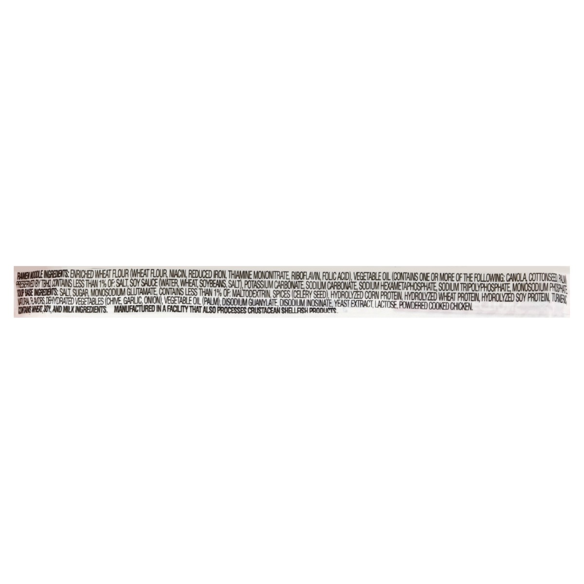 Ramen Noodle Ingredients: Enriched Wheat Flour (Wheat Flour, Niacin, Reduced Iron, Thiamine Mononitrate, Riboflavin, Folic Acid), Vegetable Oil (Contains One or More of the Following: Canola, Cottonse…