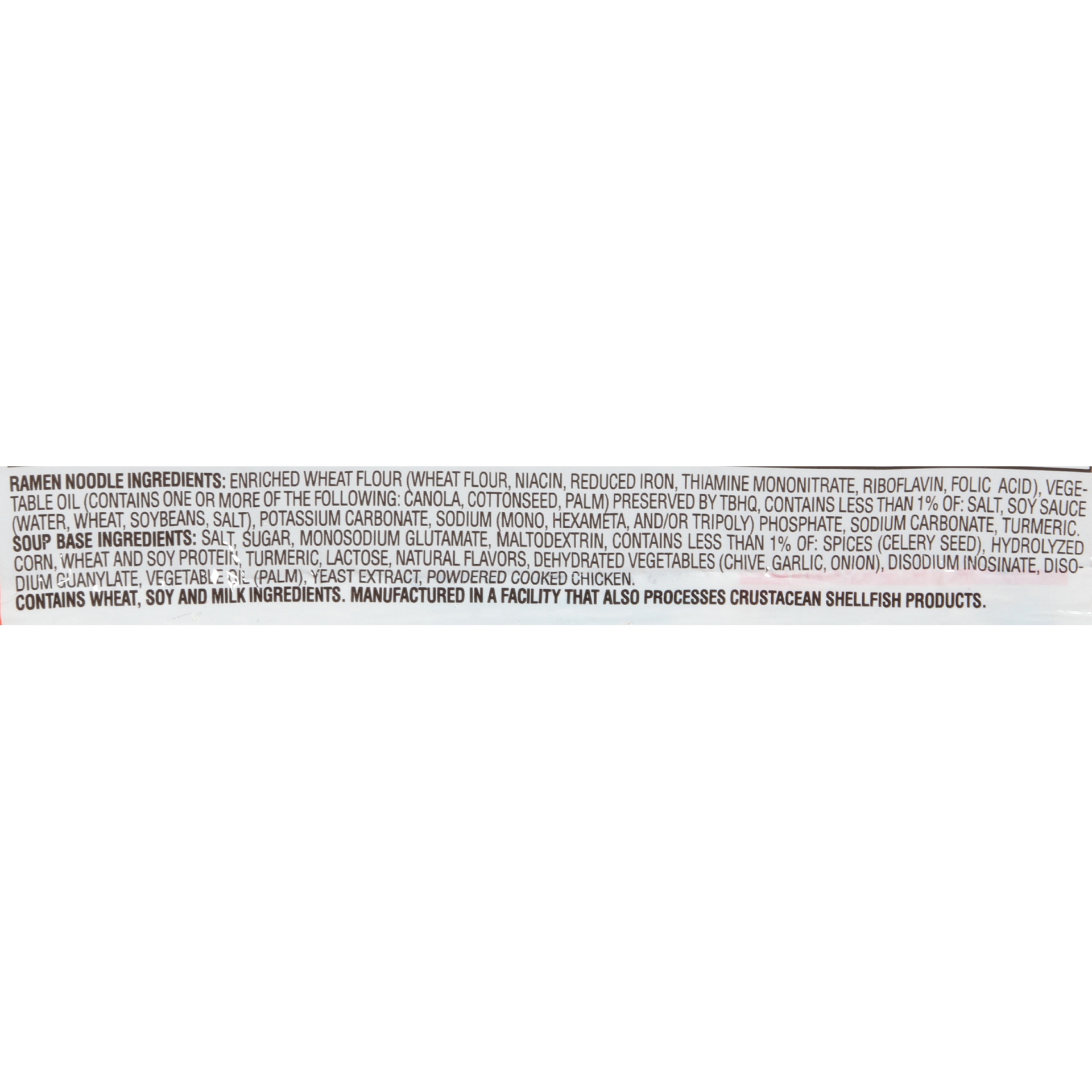 Ramen Noodle Ingredients: Enriched Wheat Flour (Wheat Flour, Niacin, Reduced Iron, Thiamine Mononitrate, Riboflavin, Folic Acid), Vegetable Oil (Contains One or More of the Following: Canola, Cottonse…