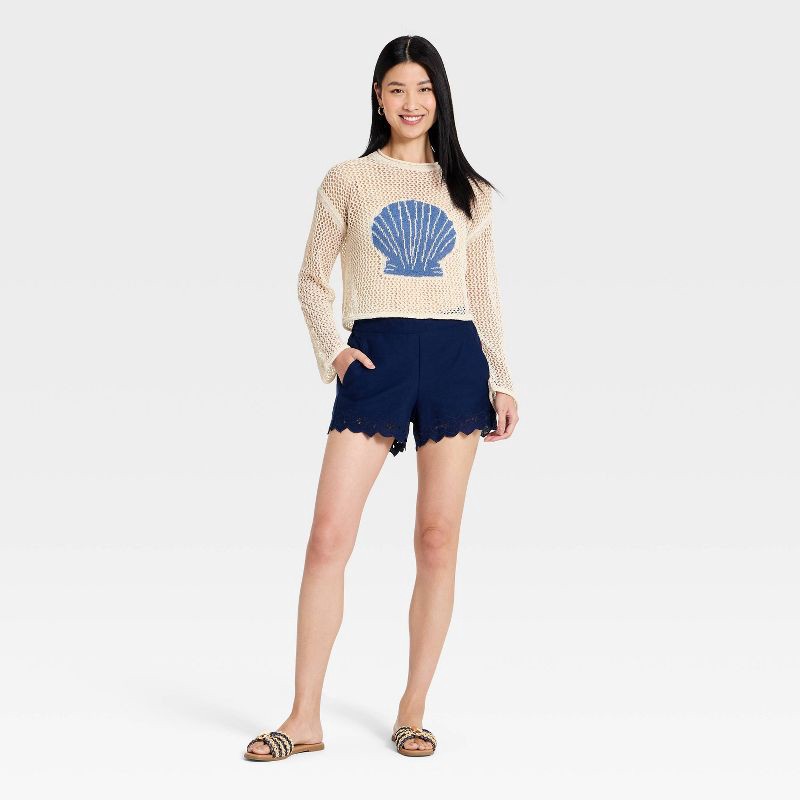 Add coastal charm to your wardrobe with this Open-Work Shell Pullover Sweater from A New Day™. Made from midweight 100% recycled polyester, this cream-colored pointelle sweater features an eye-catchin…