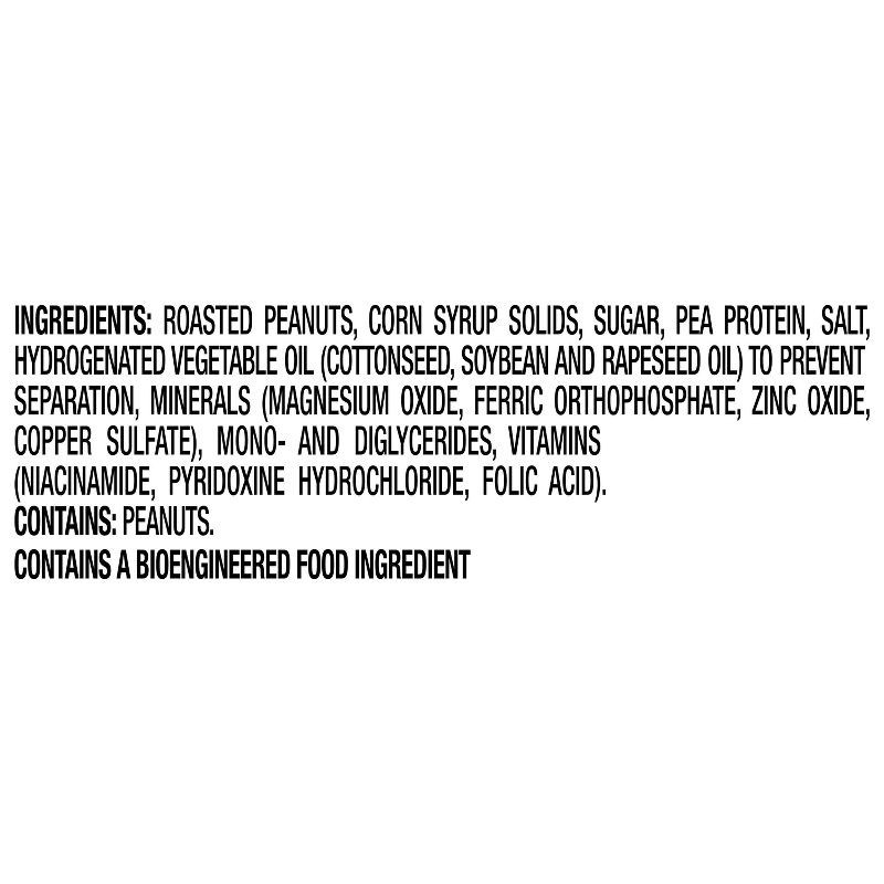 Roasted Peanuts, Corn Syrup Solids, Sugar, Soy Protein Concentrate, Salt, Hydrogenated Vegetable Oil (Cottonseed, Soybean and Rapeseed Oil) to prevent separation, Mono- and Diglycerides, Minerals (Mag…