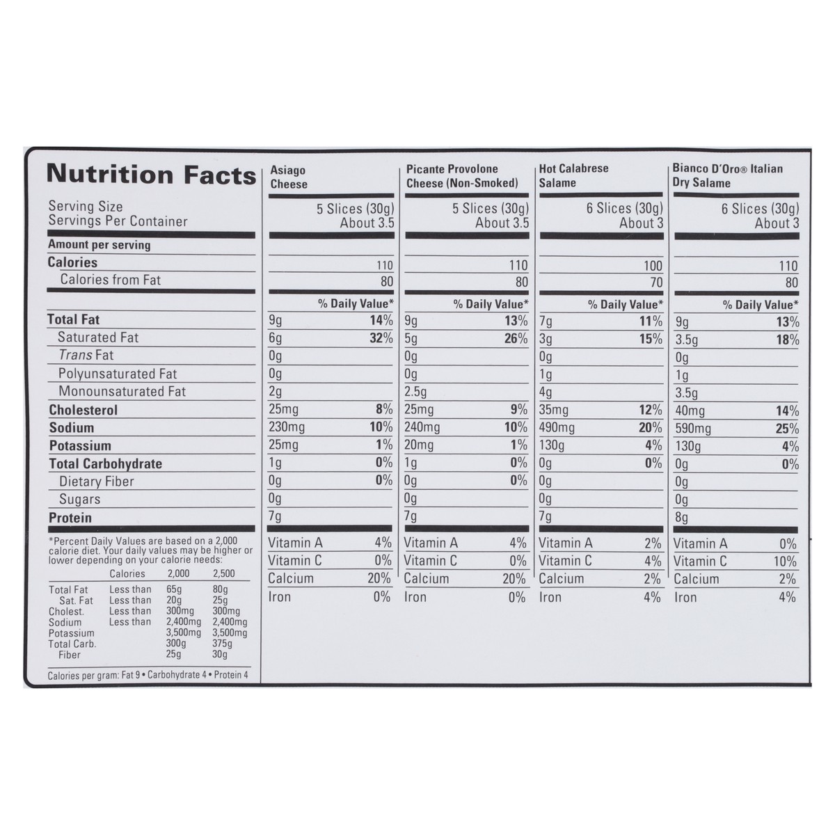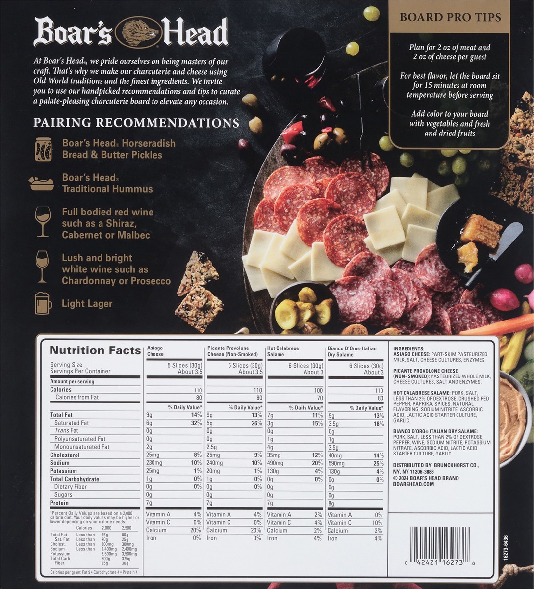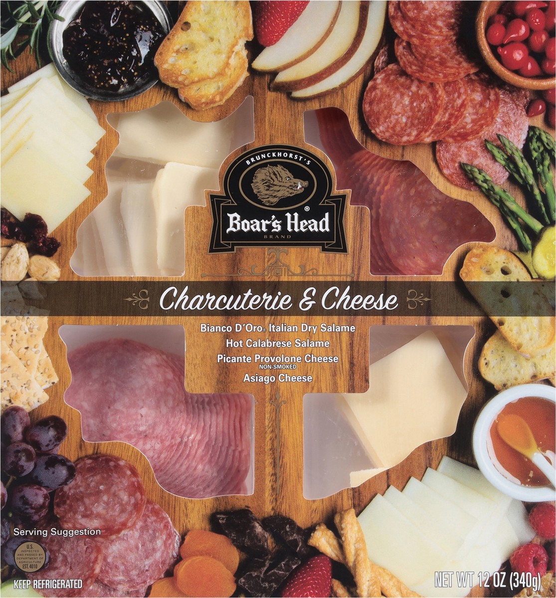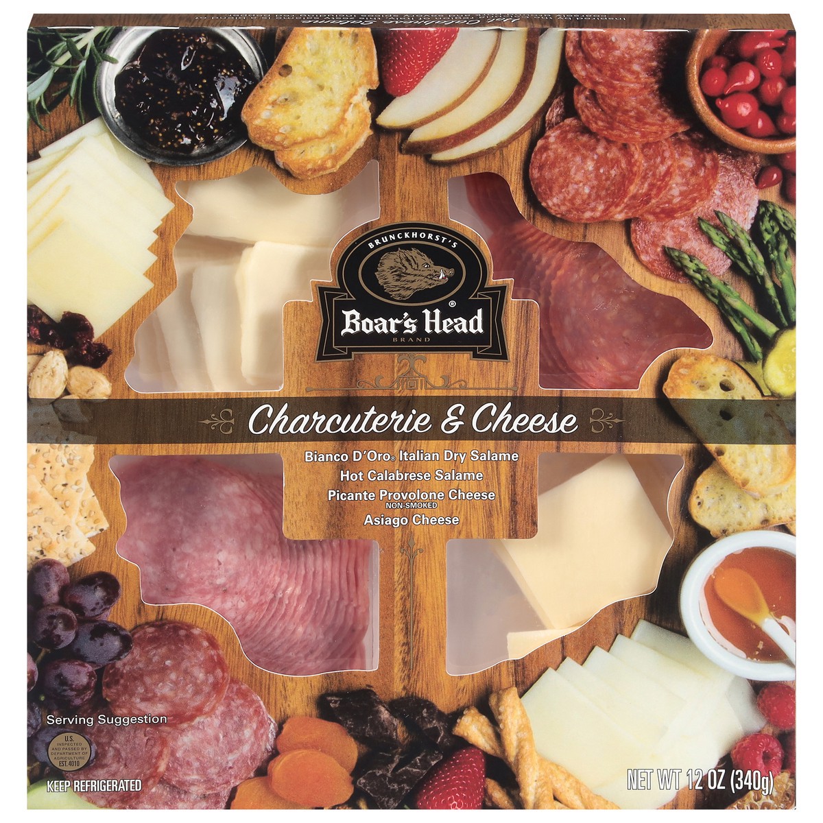 The Boar’s Head Charcuterie & Cheese Tray includes 2 dry cured meats and 2 cheeses: Bianco D’Oro Italian Dry Salame, Hot Calabrese Salame, Asiago Cheese, and Picante Provolone Cheese. Each item is ind…