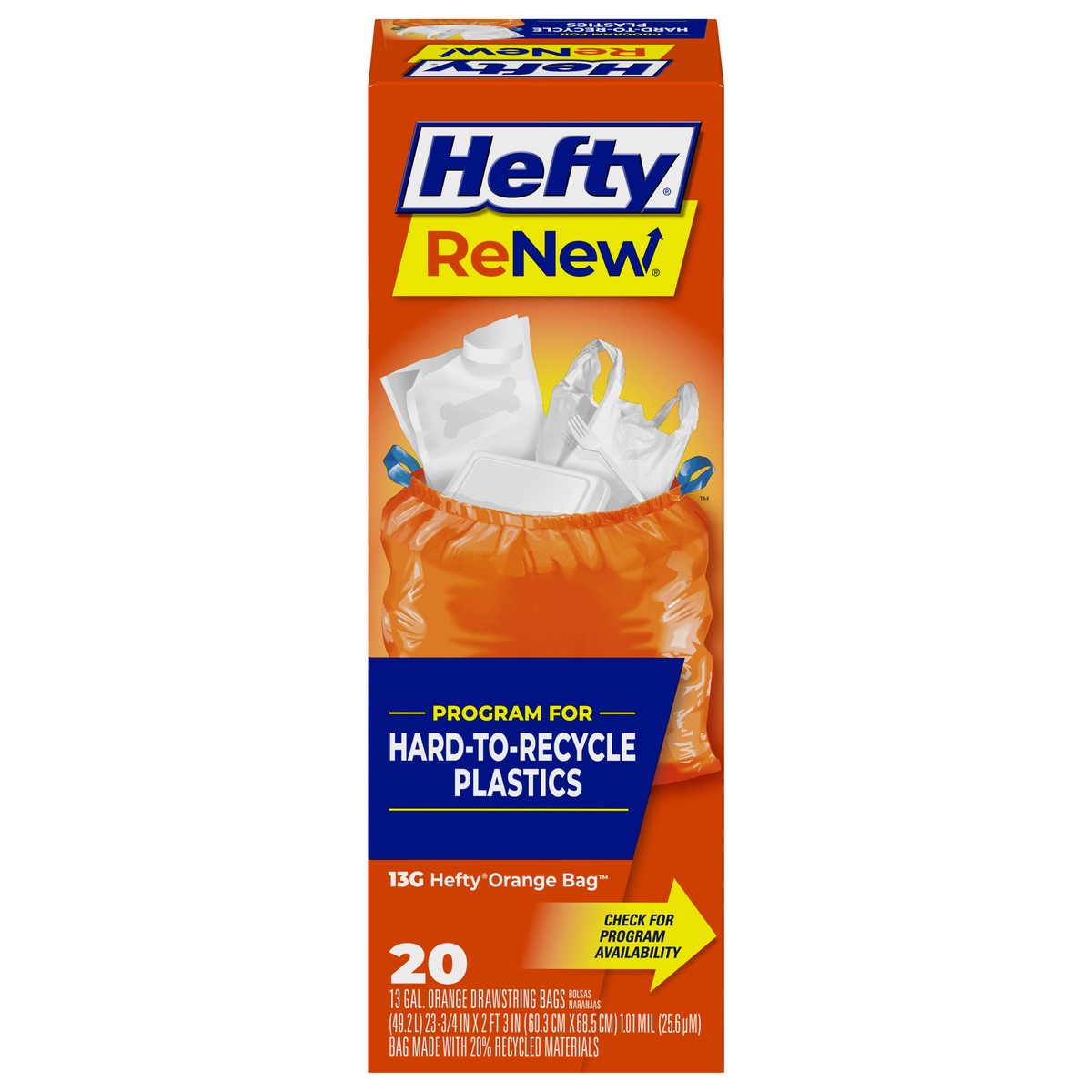- Orange Bag—This package contains twenty Hefty ReNew trash bags