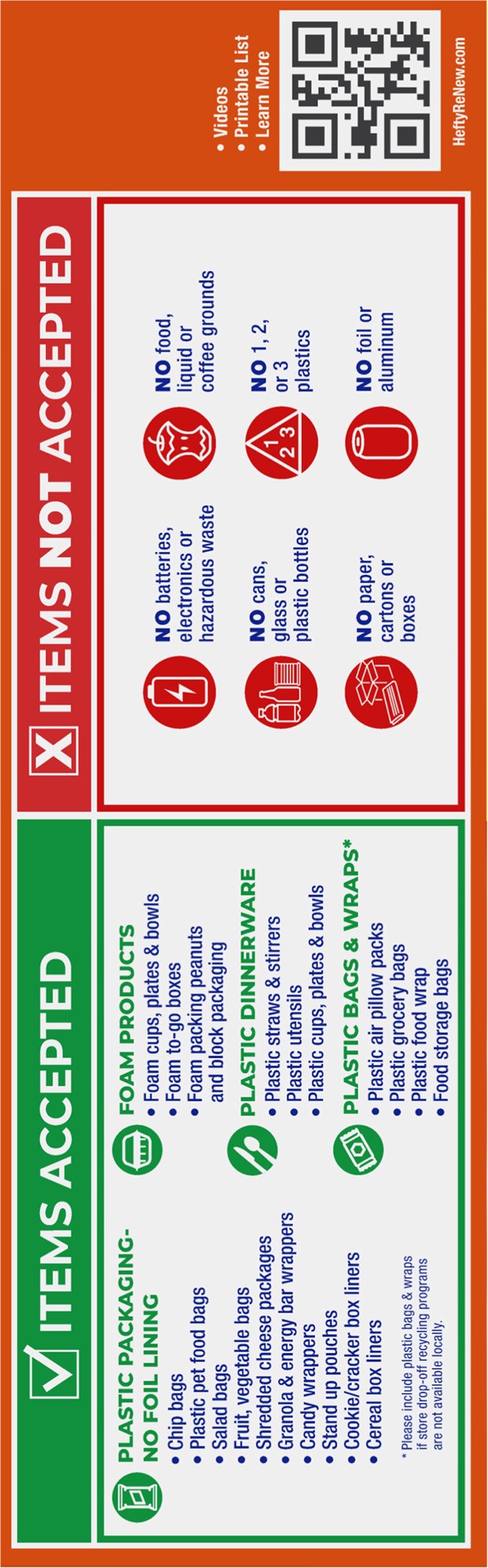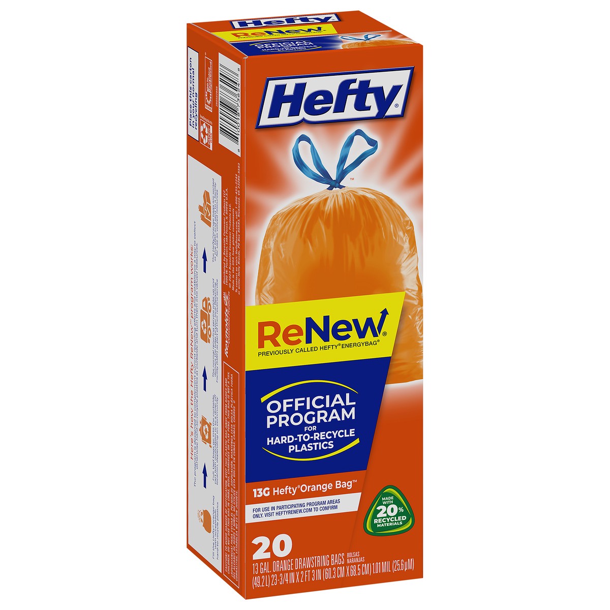 Designed to complement current recycling efforts in participating areas, the Hefty ReNew™ program (formerly Hefty EnergyBag), made with 20% post-consumer recycled materials, provides a simple, conveni…