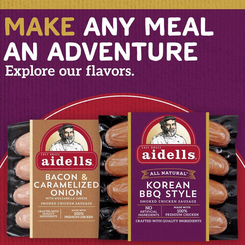 Push the boundaries of flavor with Aidells Korean BBQ Style Smoked Chicken Sausage. Our fully cooked, all natural* chicken sausage paired with diced green onions, red bell peppers, soy sauce, ginger a…