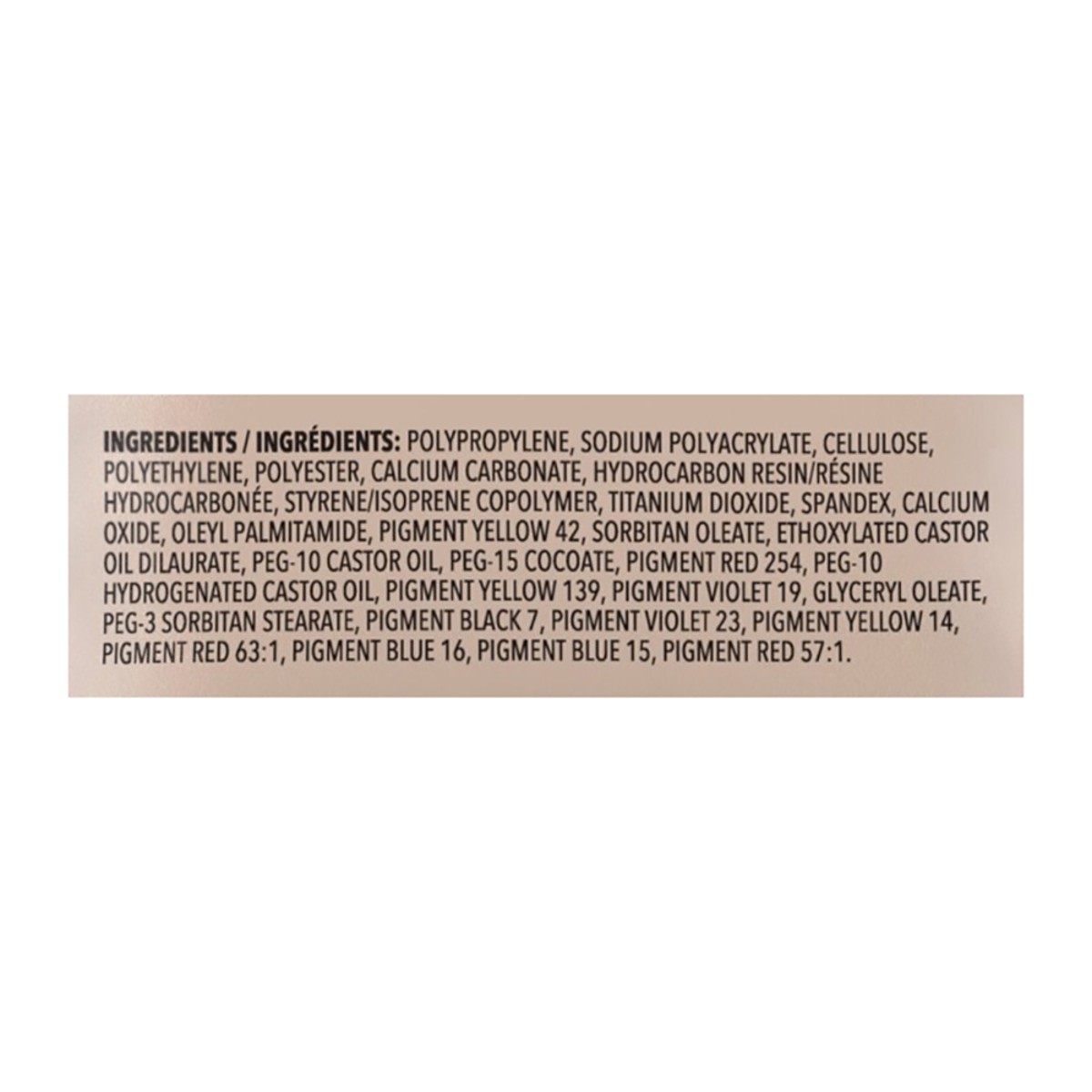 Polypropylene, Sodium Polyacrylate, Cellulose, Polyethylene, Polyester, Hydrocarbon Resin/Resine Hydrocarbonee, Calcium Carbonate, Styrene/Isoprene Copolymer, Titanium Dioxide, Spandex, Oleyl Palmitamā¦