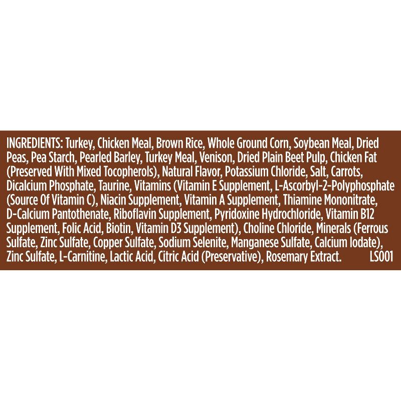 Turkey, Chicken Meal, Brown Rice, Whole Ground Corn, Soybean Meal, Dried Peas, Pea Starch, Pearled Barley, Turkey Meal, Venison, Dried Plain Beet Pulp, Chicken Fat (Preserved with Mixed Tocopherols), …