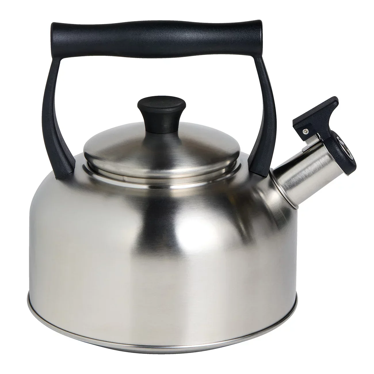 Whistling when water reaches its boiling point, this Rorence stainless steel tea kettle is a sleek addition to any stovetop. With a 2.6 liter capacity for water, it has a sturdy black handle and a wel…
