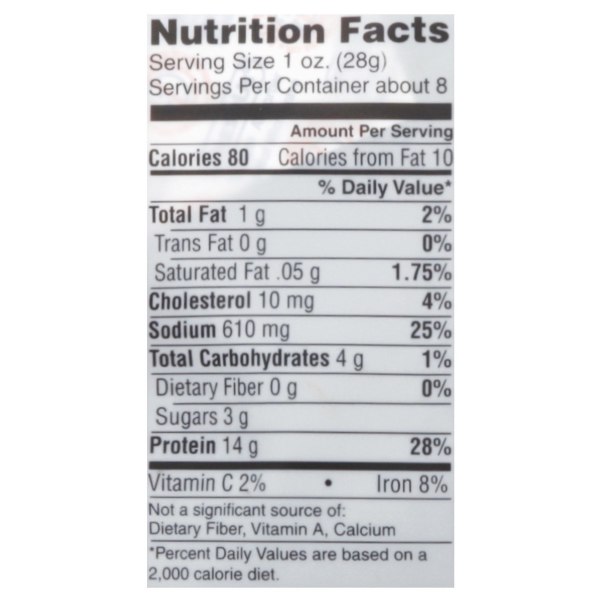 Smoke flavoring added. Fat 1 gram. Protein 14 grams. No MSG. No nitrites. No preservatives. Thank you for purchasing one of our great products. You have made the perfect choice in meat snacking. Enjoy…