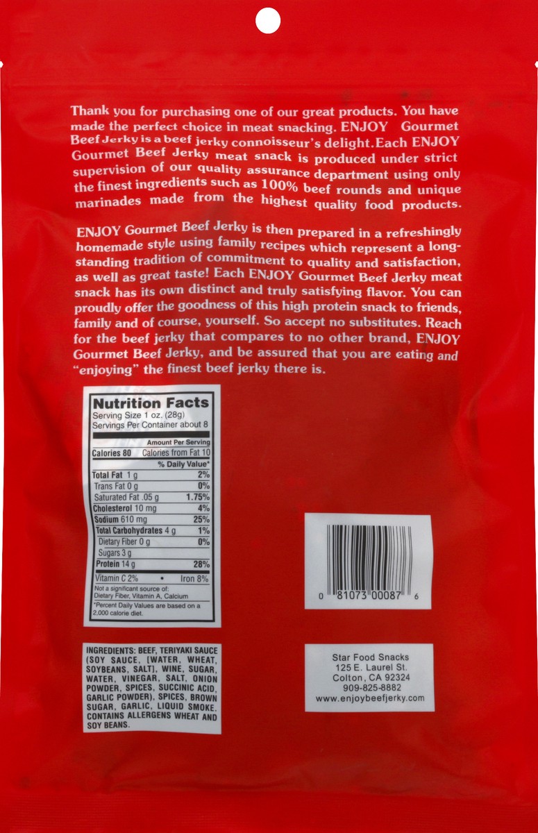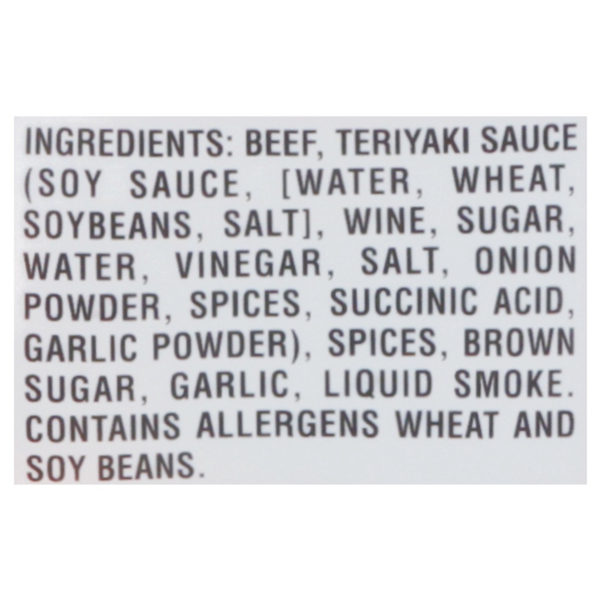Beef, Teriyaki Sauce (Soy Sauce, [Water, Wheat, Soybeans, Salt], Wine, Sugar, Water, Vinegar, Salt, Onion Powder, Spices, Succinic Acid, Garlic Powder), Spices, Brown Sugar, Garlic, Liquid Smoke.