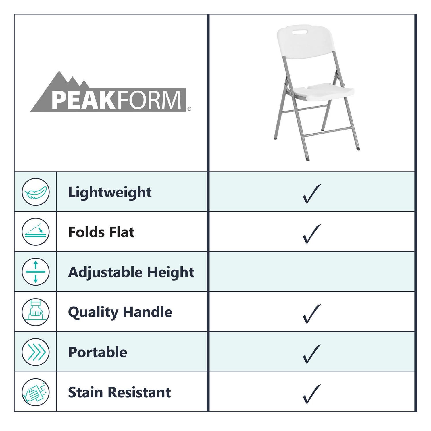 For your event, gathering, or everyday needs, the Peakform Blow-Molded Chair is a simple and accessible solution. Transport it easily using the lightweight and sturdy folding frame and carry handle. U…