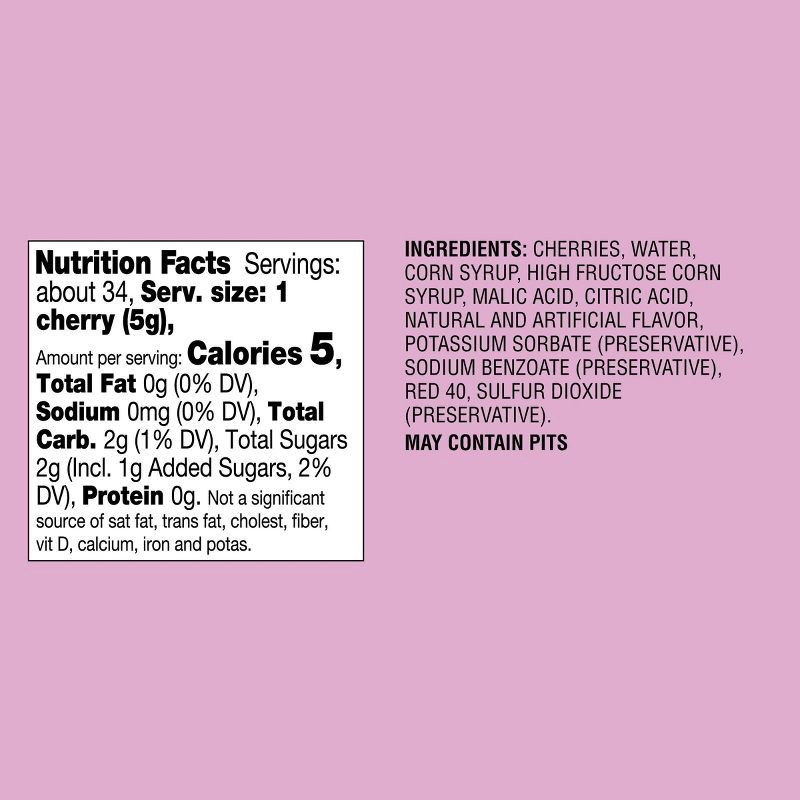 CHERRIES, WATER, CORN SYRUP, HIGH FRUCTOSE CORN SYRUP, MALIC ACID, CITRIC ACID, NATURAL AND ARTIFICIAL FLAVOR, POTASSIUM SORBATE (PRESERVATIVE), SODIUM BENZOATE (PRESERVATIVE), RED 40, SULFUR DIOXIDE …