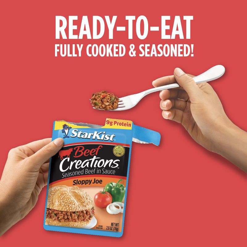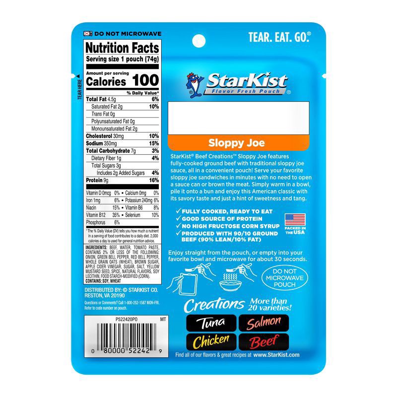 StarKist® Beef Creations™ Sloppy Joe features fully cooked ground beef with traditional sloppy joe sauce, all in a convenient Pouch! This appetizing combination of 90/10 lean ground beef mixed with on…