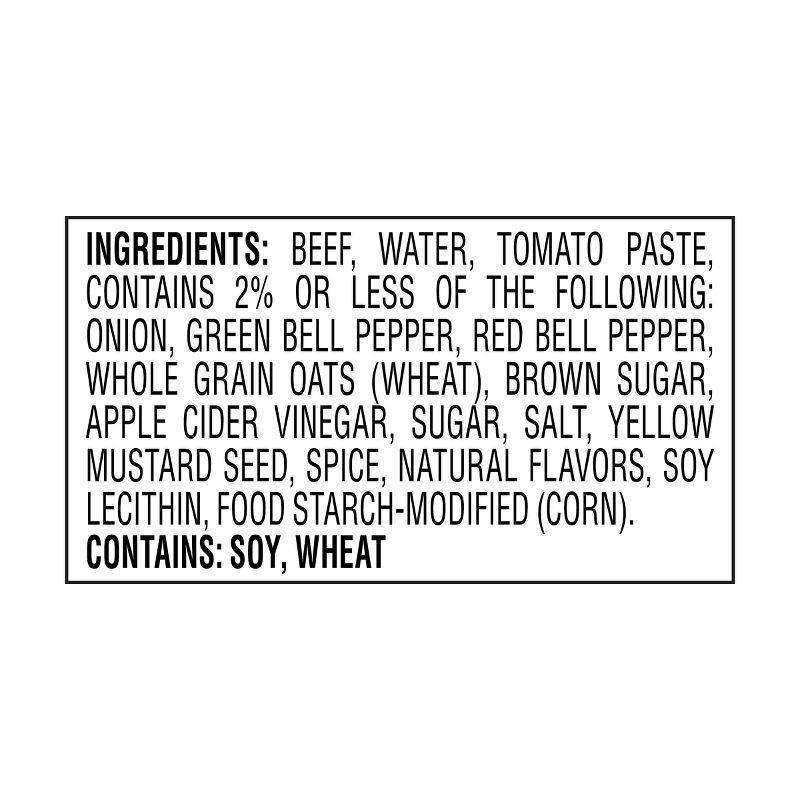 BEEF, WATER, TOMATO PASTE, CONTAINS 2% OR LESS OF THE FOLLOWING: ONION, GREEN BELL PEPPER, RED BELL PEPPER, WHOLE GRAIN OATS (WHEAT), BROWN SUGAR, APPLE CIDER VINEGAR, SUGAR, SALT, YELLOW MUSTARD SEED…