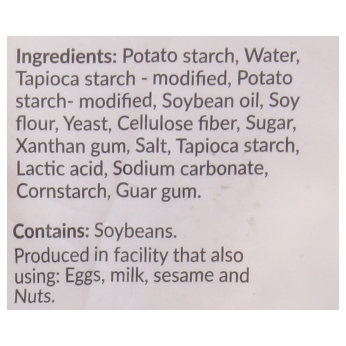 Potato Starch, Water, Tapioca Starch - Modified, Potato Starch- Modified, Soybean Oil, Soy Flour, Yeast, Cellulose Fiber, Sugar, Xanthan Gum, Salt, Tapioca Starch, Lactic Acid, Sodium Carbonate, Corns…