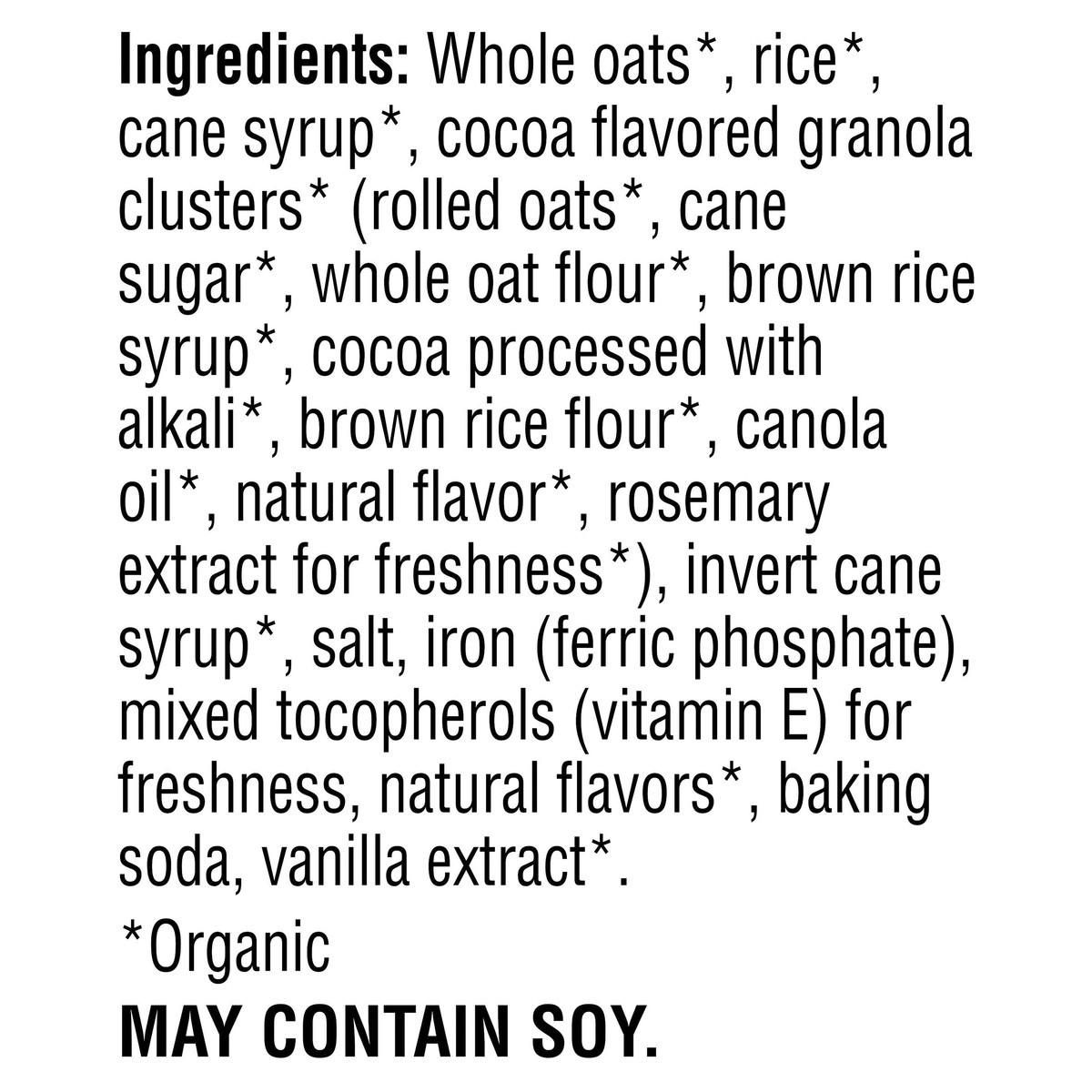 Whole Oats*\, Rice*\, Cane Syrup*\, Cocoa Flavored Granola Clusters* (Rolled Oats*\, Cane Sugar*\, Whole Oat Flour*\, Brown Rice Syrup*\, Cocoa Processed with Alkali*\, Brown Rice Flour*\, Canola Oil*…