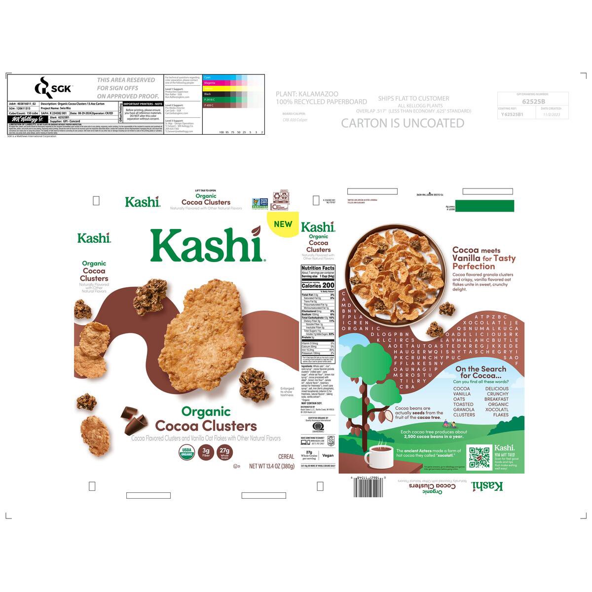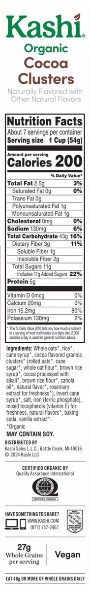 Treat yourself to the delicious taste of cocoa-flavored granola clusters and crispy, vanilla-flavored oat flakes in every bite of Kashi Organic Cocoa Clusters breakfast cereal. Whether it''s starting …