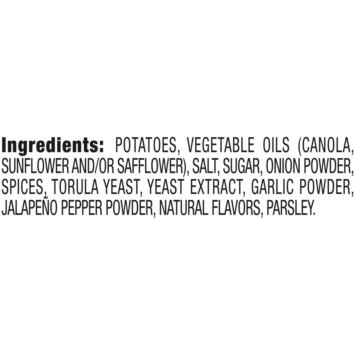 INGREDIENTS: POTATOES, VEGETABLE OILS (CANOLA, SUNFLOWER AND/OR SAFFLOWER), SALT, SUGAR, ONION POWDER, SPICES, TORULA YEAST, YEAST EXTRACT, GARLIC POWDER, JALAPEÃO PEPPER POWDER, NATURAL FLAVORS, PAR…