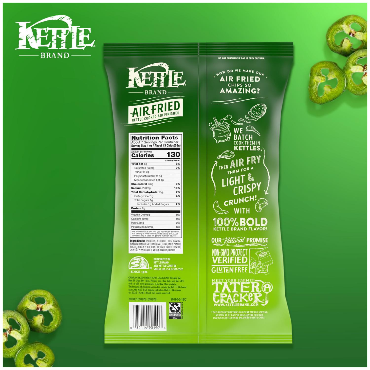 Kettle Brand Air Fried Jalapeño Kettle Chips are kettle cooked, air-fried chips that deliver a light and crispy crunch with no compromise on taste and texture. These zesty chips have 100% bold Kettle …