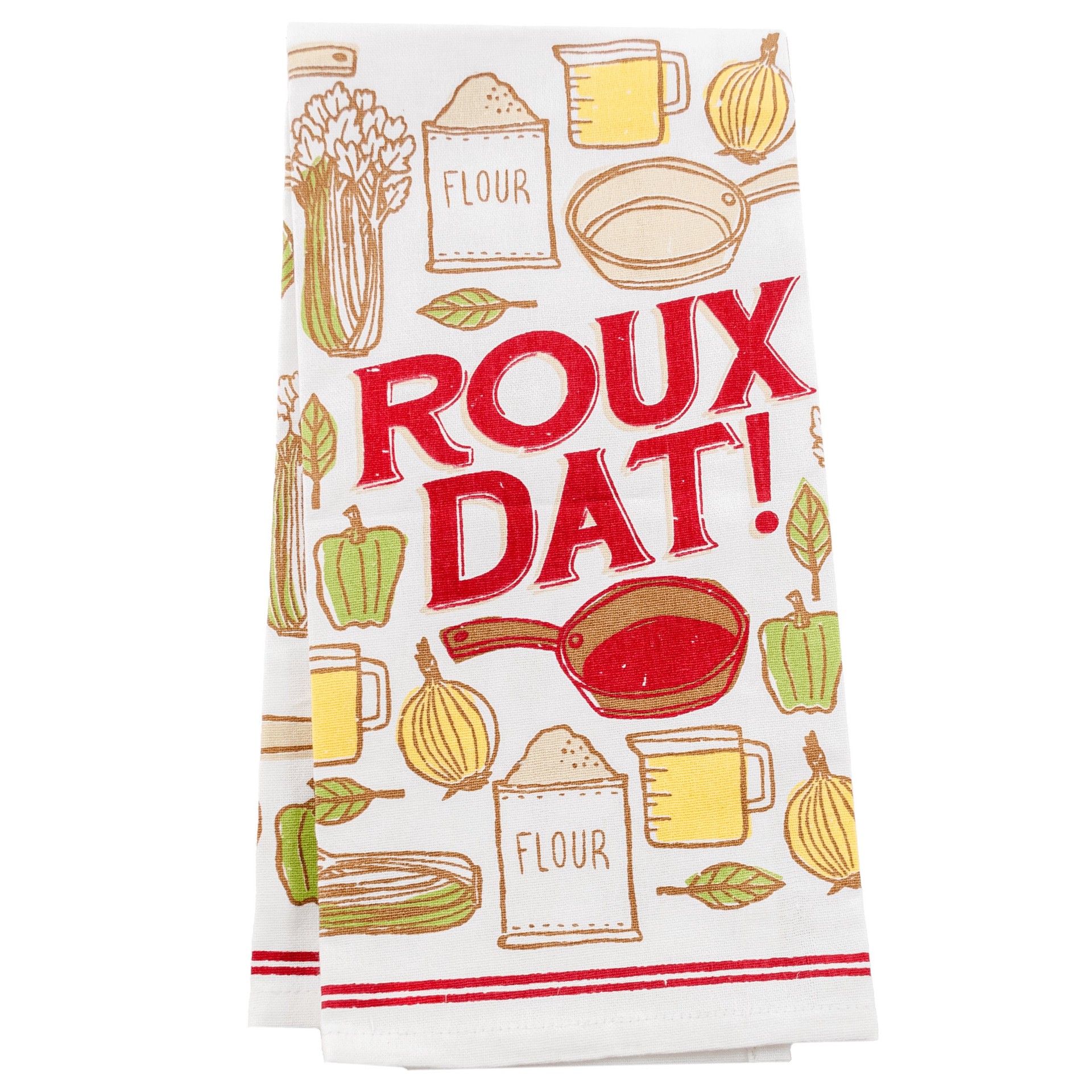 Nothing says Louisiana like a good roux and we know how to make dat! This 100% cotton tea towel by Denise Gallagher features all the necessary ingredients. Hidden loop at top for easy hanging. The ima…