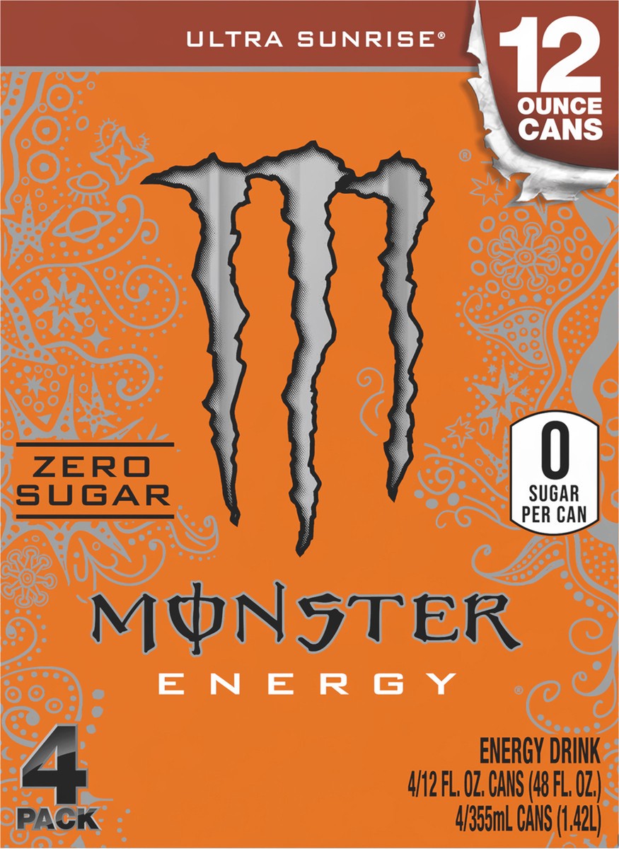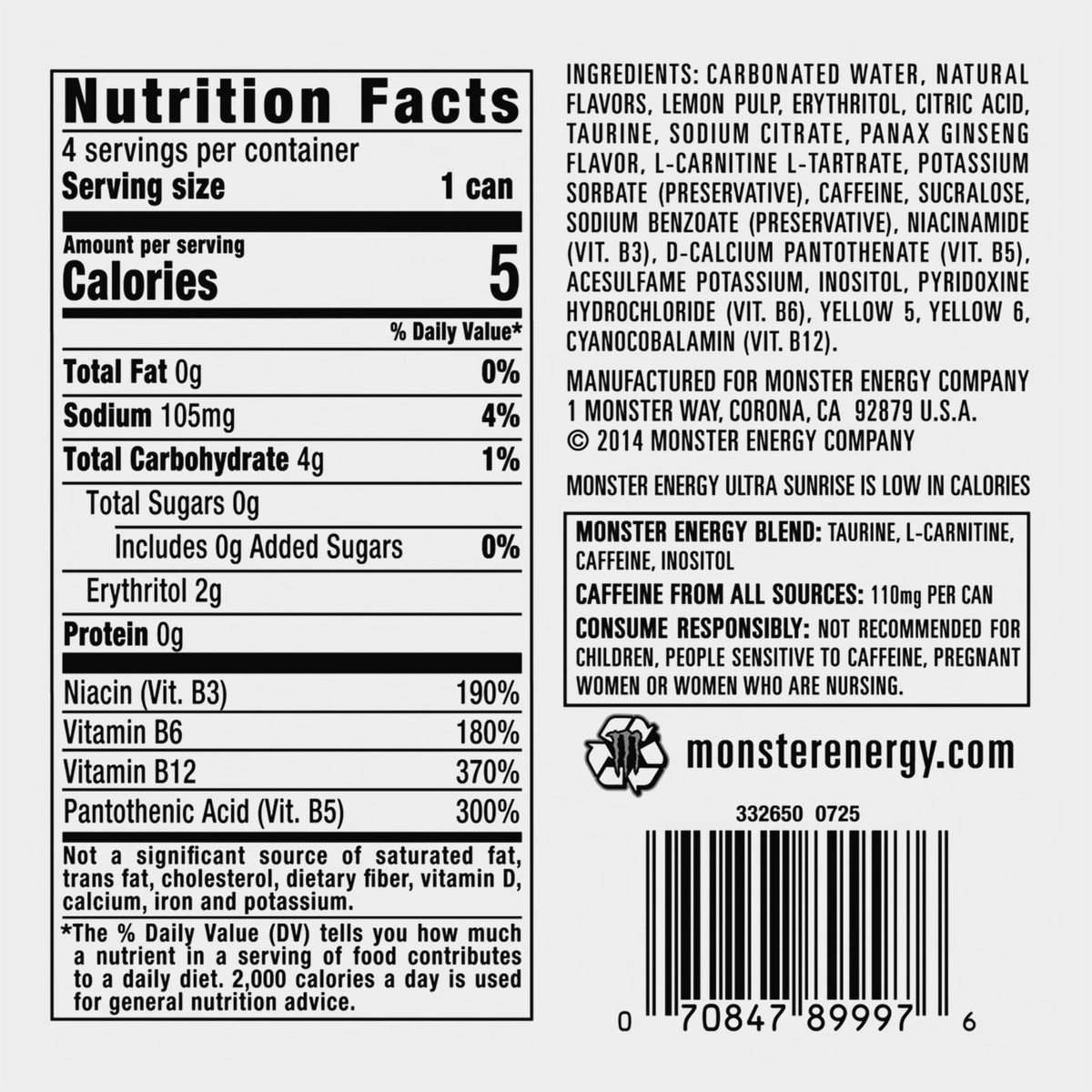 0 sugar per can. Zero sugar. Moonster Enegy Ultra Sunrise is low in calories. Caffeine from All Sources: 110 mg per can. monsterenergy.com.