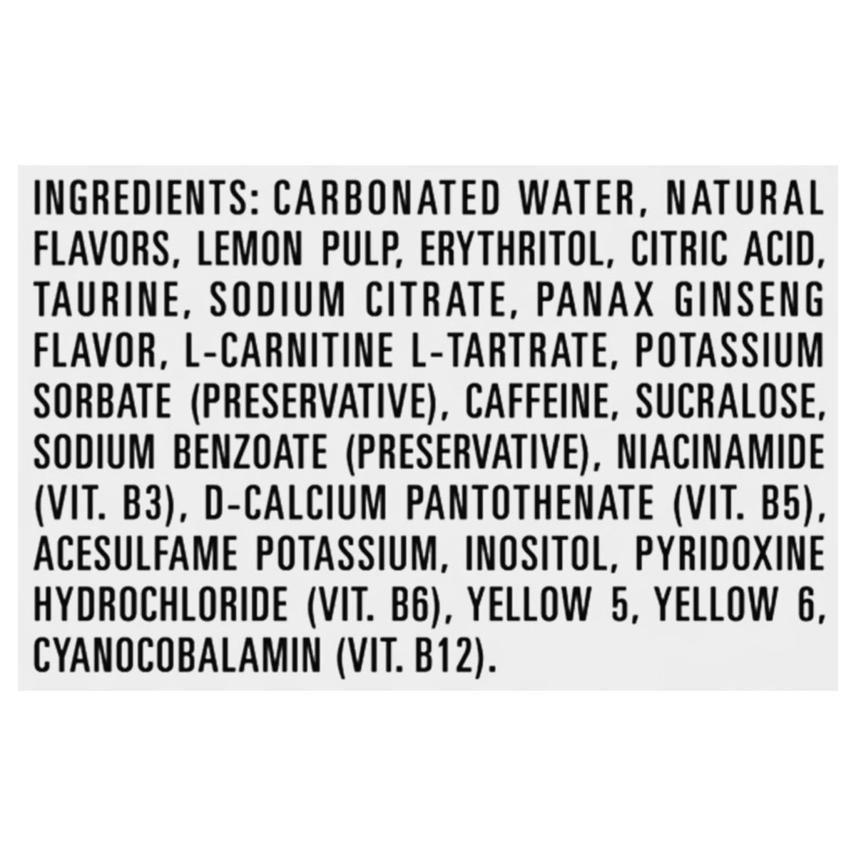 Carbonated Water, Natural Flavors, Lemon Pulp, Erythritol, Citric Acid, Taurine, Sodium Citrate, Panax Ginseng Flavor, L-Carnitine L-Tartrate, Potassium Sorbate (Preservative), Caffeine, Sucralose, So…