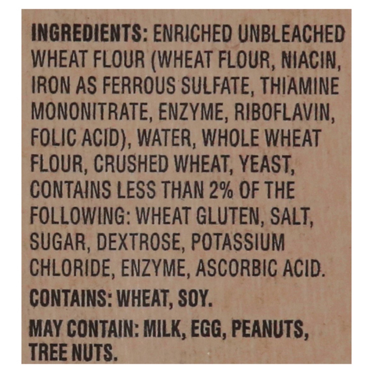 Enriched Unbleached Wheat Flour (Wheat Flour, Niacin, Iron as Ferrous Sulfate, Thiamine Mononitrate, Enzyme, Riboflavin, Folic Acid), Water, Whole Wheat Flour, Crushed Wheat, Yeast, Contains Less than…