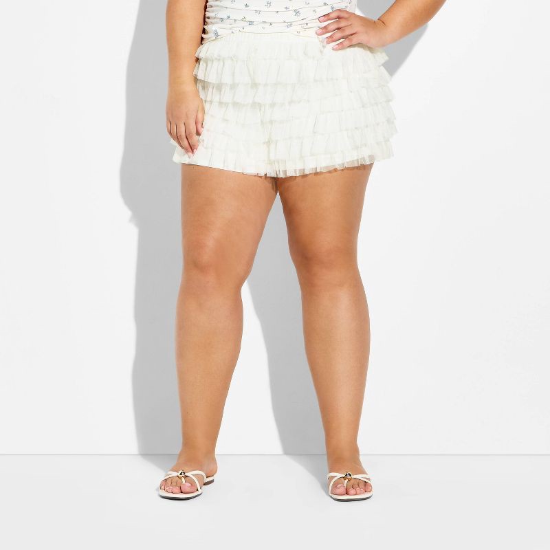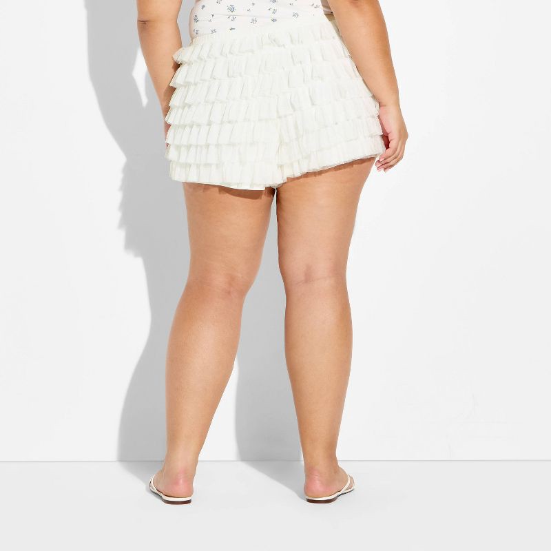 Mesh bloomer shorts from Wild Fable™ with tiered ruffle accents. Made from 100% nylon fabric with 100% recycled polyester full lining for comfortable all-day wear. Tailored in a high-rise cut with a r…