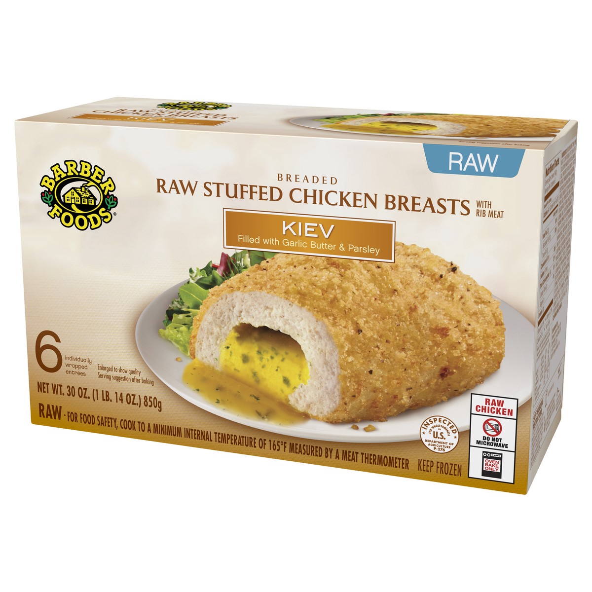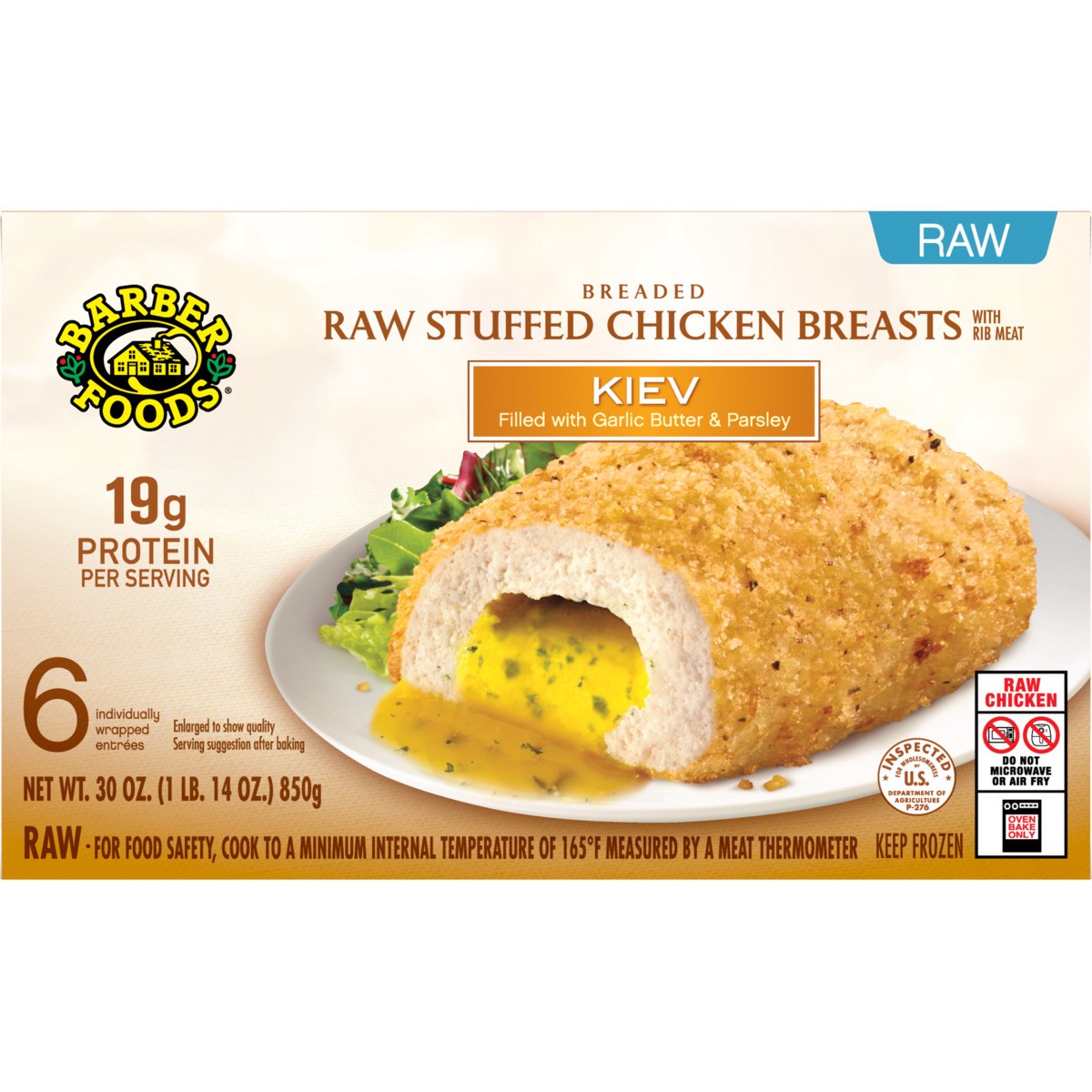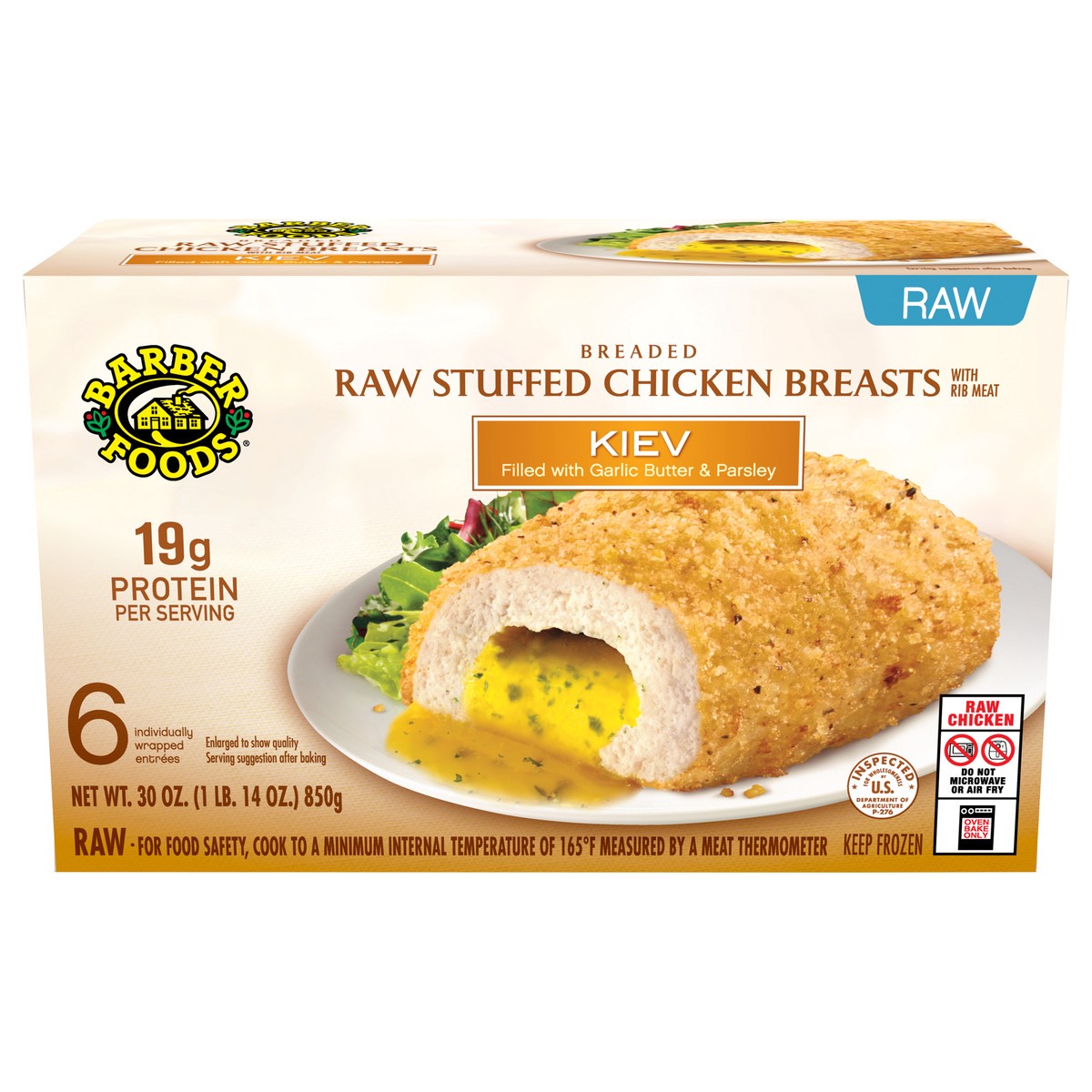 For a delicious entree that is easy to prepare, Barber Foods Breaded Raw Stuffed Chicken Breasts Kiev are perfect for any night of the week. We start with a combination of garlic butter and parsley, w…
