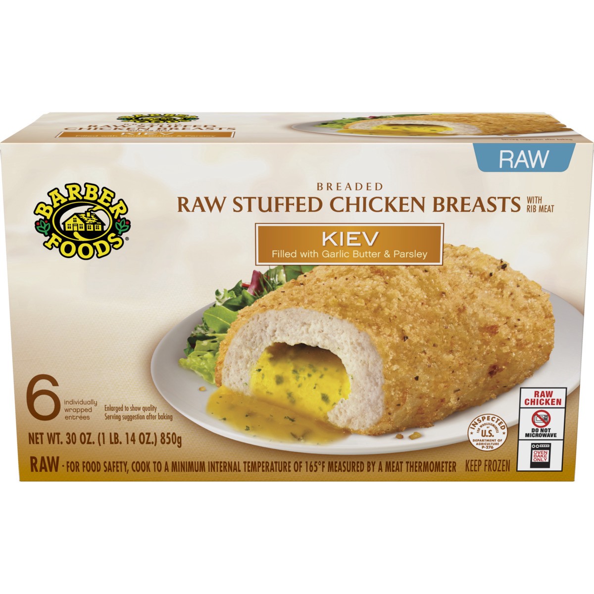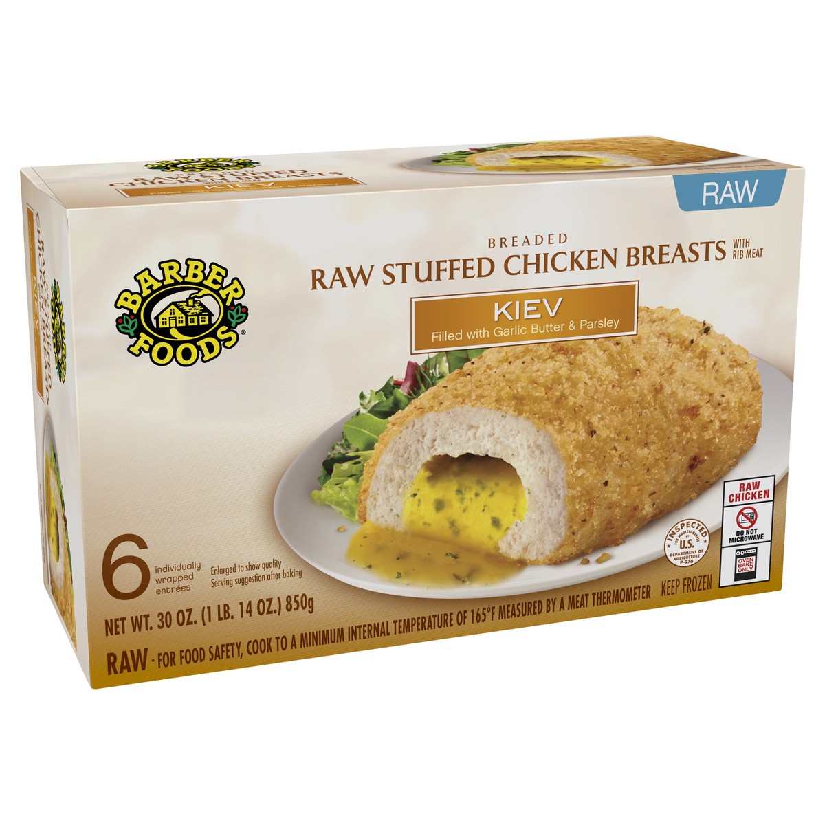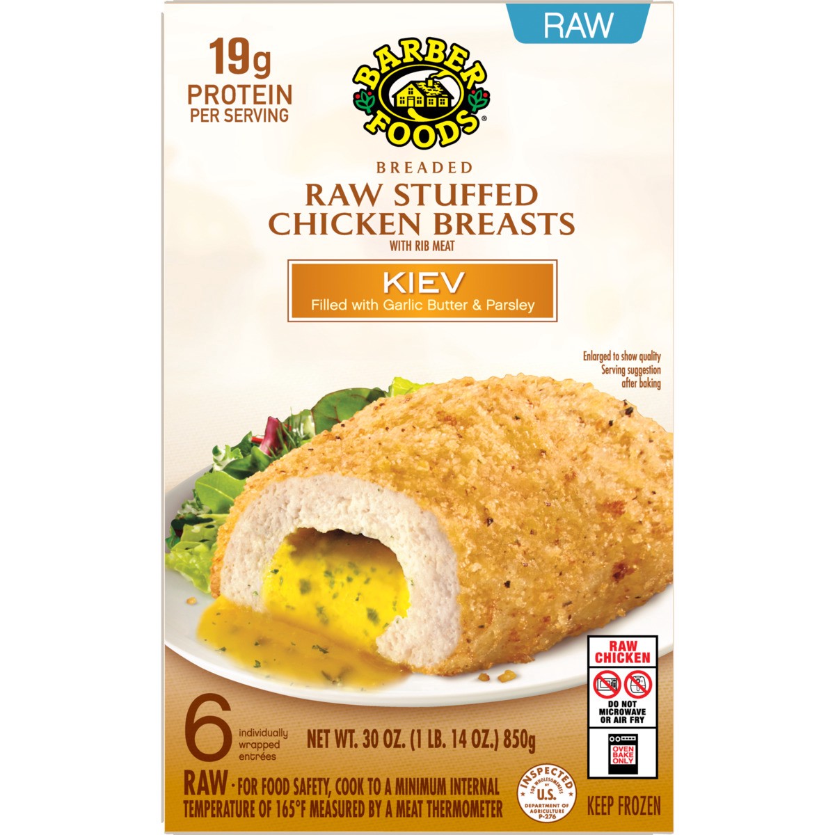 For a delicious entree that is easy to prepare, Barber Foods Breaded Raw Stuffed Chicken Breasts Kiev are perfect for any night of the week. We start with a combination of garlic butter and parsley, w…