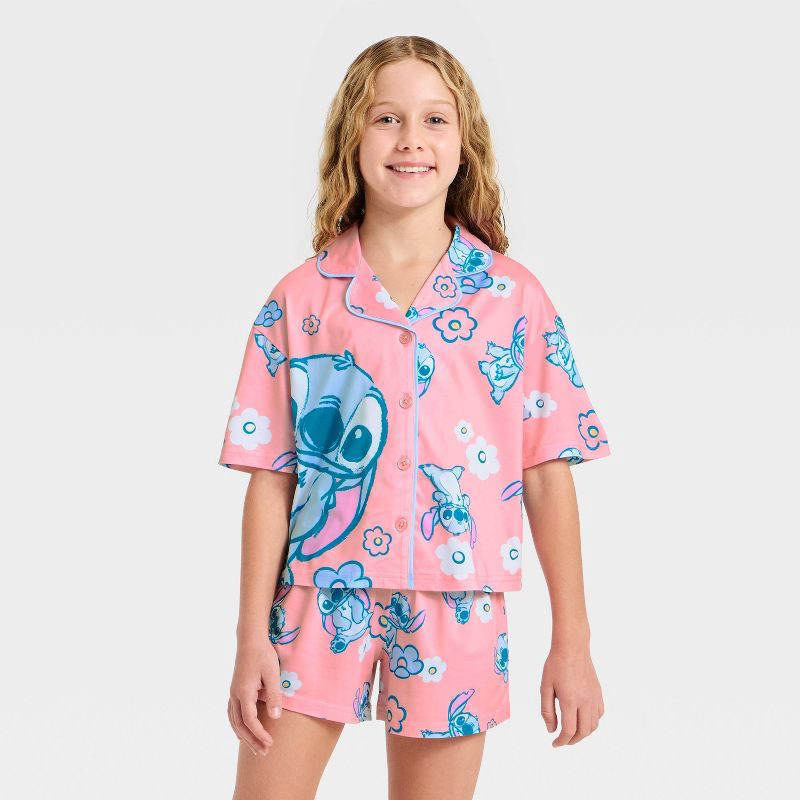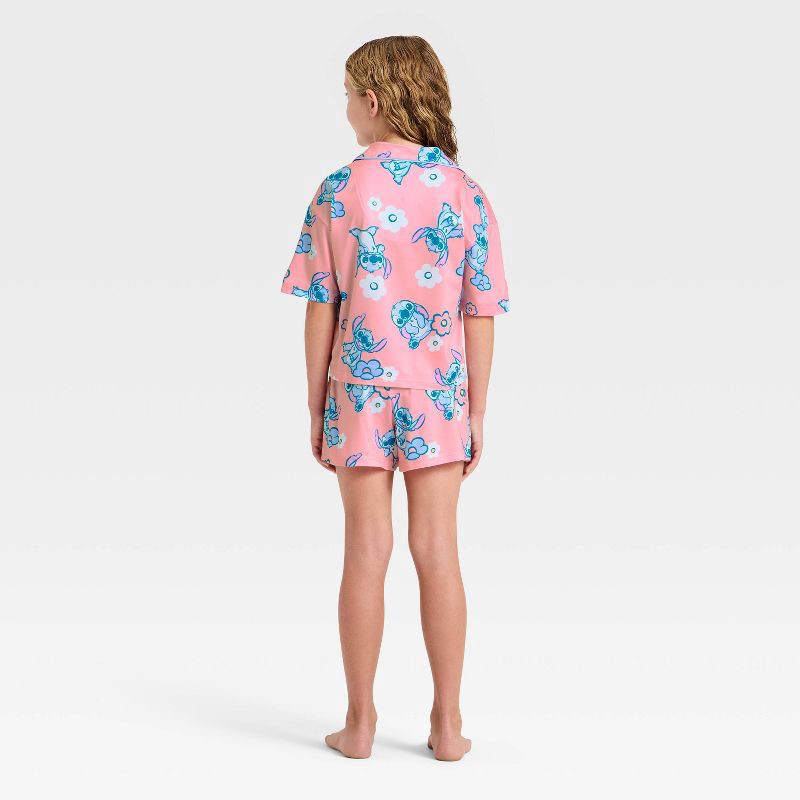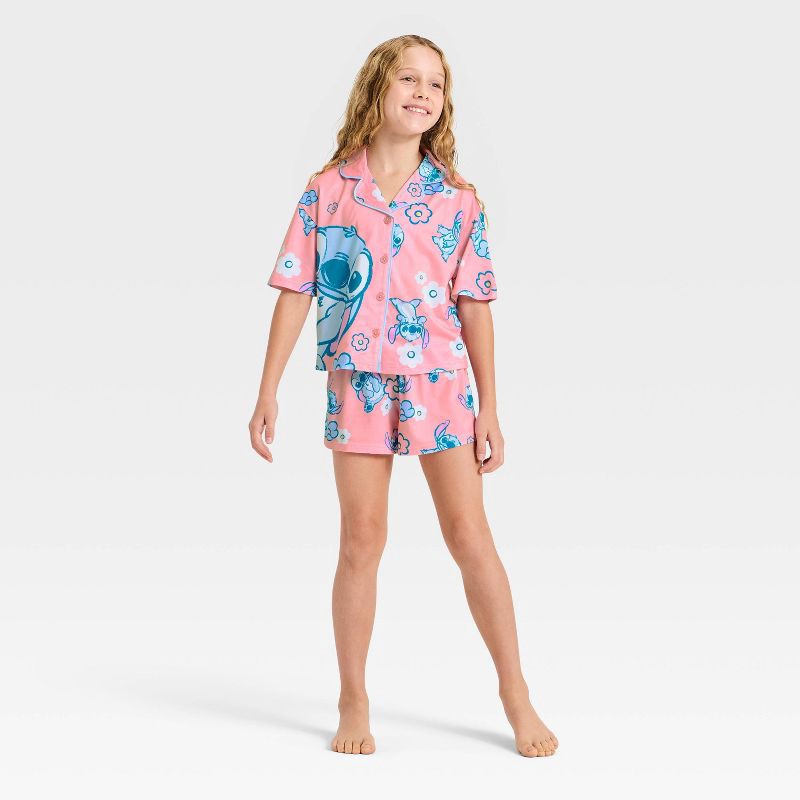 Girls' 2pc Lilo & Stitch Button-Down Pajama Set - Pink M