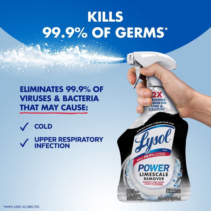 - DISCLAIMER: **2X Cleaning Power on Lime & Calcium vs. a leading bathroom spray. * when used as directed. ***Kills 99.9% of Enterobacter aerogenes and Staphylococcus aureus on hard, non-porous surfaces in 30 seconds.