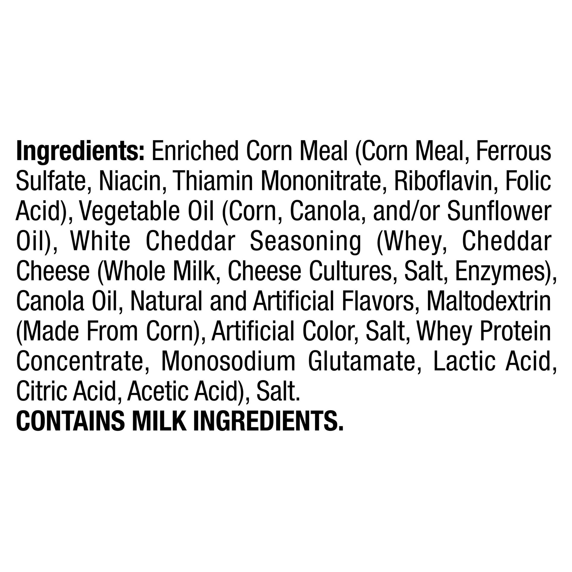 Ingredients: ENRICHED CORN MEAL (CORN MEAL, FERROUS SULFATE, NIACIN, THIAMIN MONONITRATE, RIBOFLAVIN, FOLIC ACID), VEGETABLE OIL (CORN, CANOLA, AND/OR SUNFLOWER OIL), WHITE CHEDDAR SEASONING (WHEY, CH…