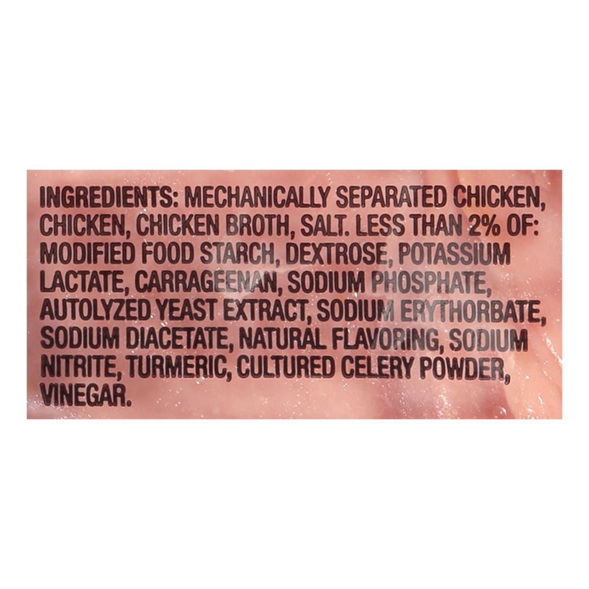 Mechanically Separated Chicken, Chicken, Chicken Broth, Salt, Less than 2% of: Modified Food Starch, Dextrose, Potassium Lactate, Carrageenan, Sodium Phosphate, Autolyzed Yeast Extract, Sodium Erythor…