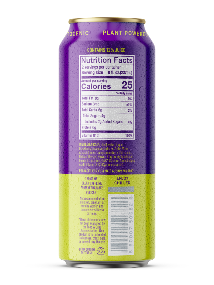Purified Water, Sugar, Blackberry Juice Concentrate, Yerba Mate Extract, Lemon Juice Concentrate, Citric Acid, Natural Flavors, Stevia, Proprietary Functional Blend: L-Theanine, GABA (Gamma Aminobutyr…