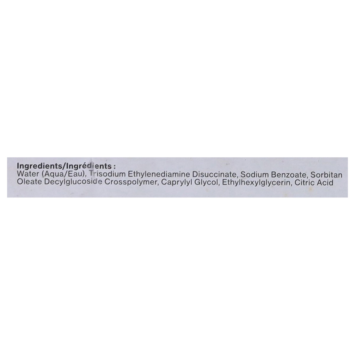 Water (Aqua/Eau), Trisodium Ethylenediamine Disuccinate, Sodium Benzoate, Sorbitan Oleate Decylglucoside Crosspolymer, Caprylyl Glycol, Ethylhexylglycerin, Citric Acid