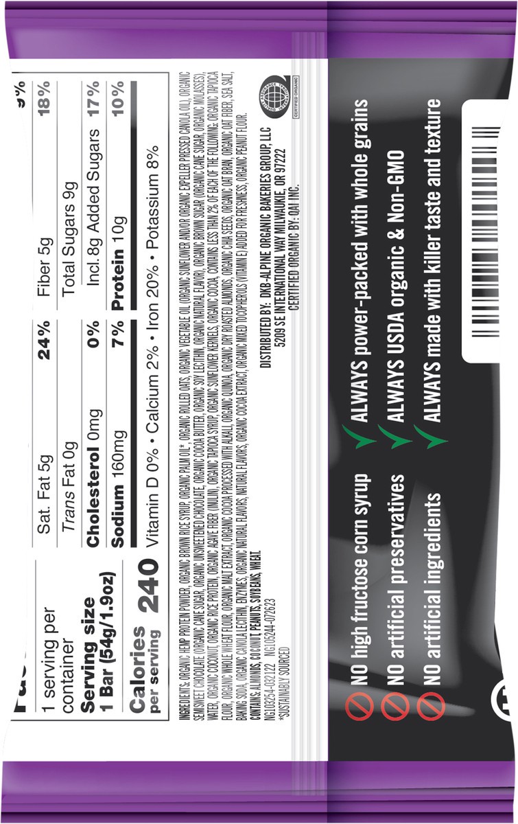 - Baked with two types of organic chocolate, coconut, rolled oats, chia seeds, and quinoa