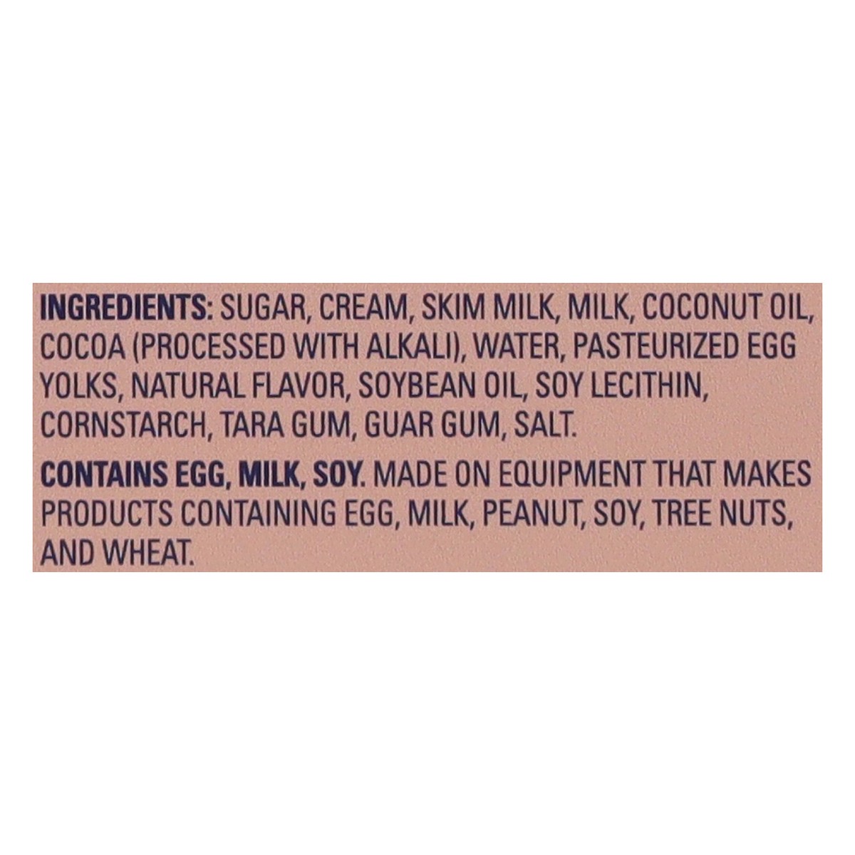 Sugar, Cream, Skim Milk, Milk, Coconut Oil, Cocoa (Processed with Alkali), Water, Pasteurized Egg Yolks, Natural Flavor, Soybean Oil, Soy Lecithin, Cornstarch, Tara Gum, Guar Gum, Salt.