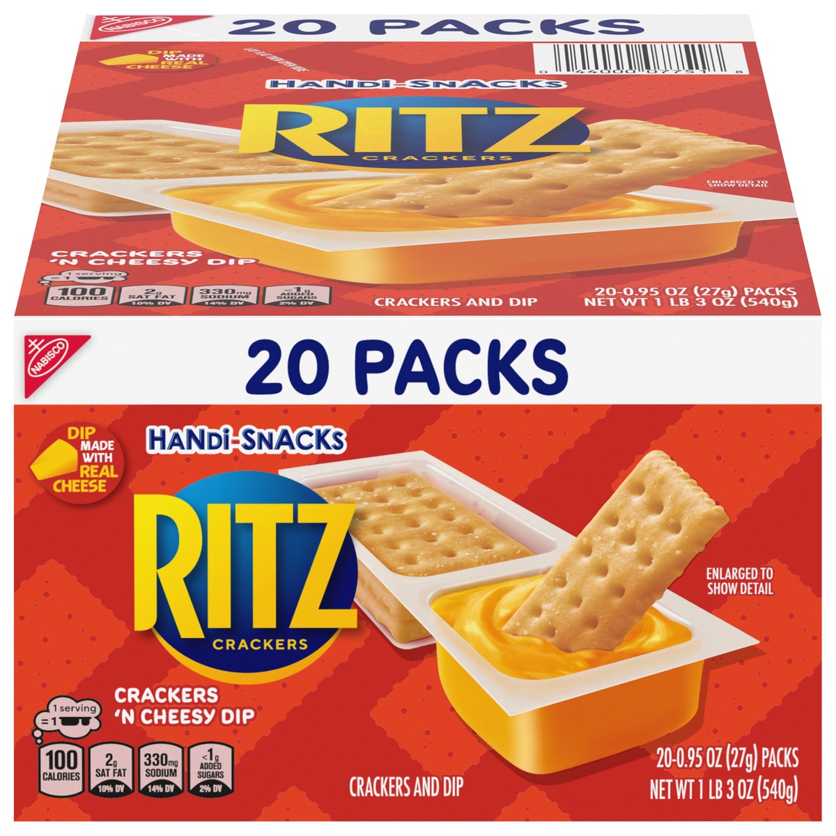 RITZ Handi-Snacks Crackers and Cheese Dip pairs the rich, buttery taste of RITZ snack crackers with a cheesy dip made with real cheese. Each of these tasty cracker packs contains 100 calories per serv…