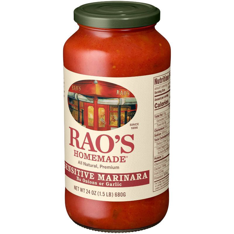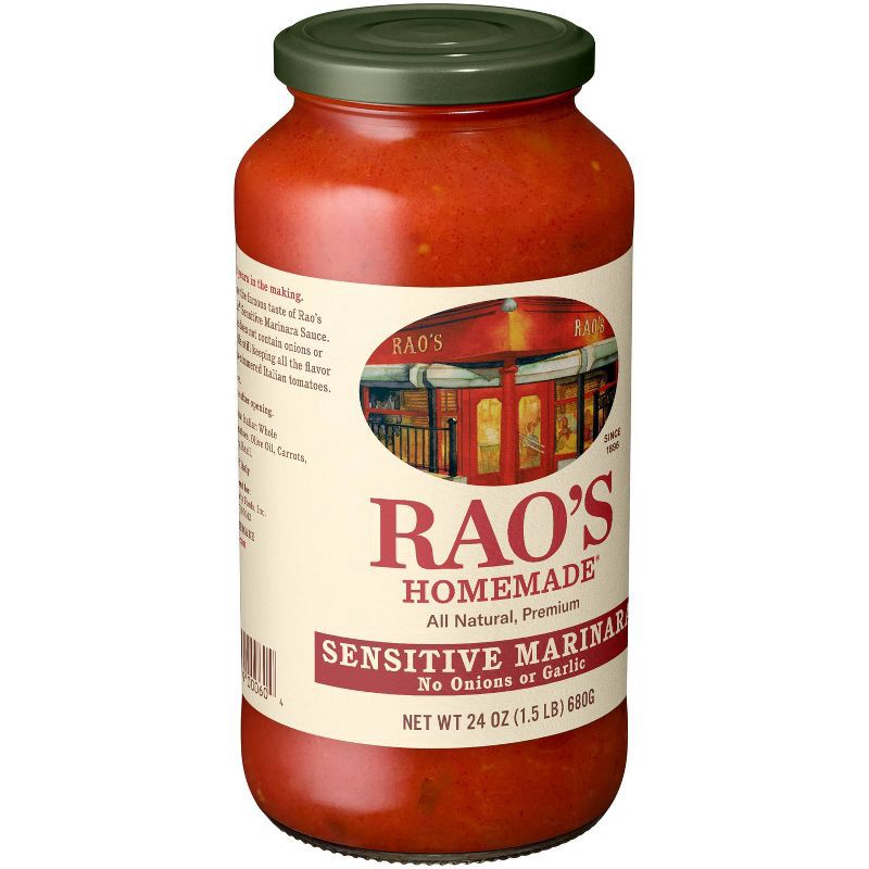 - Rao's Homemade® Sensitive Sauce is made with whole‑peeled Italian tomatoes and does not contain onions or garlic