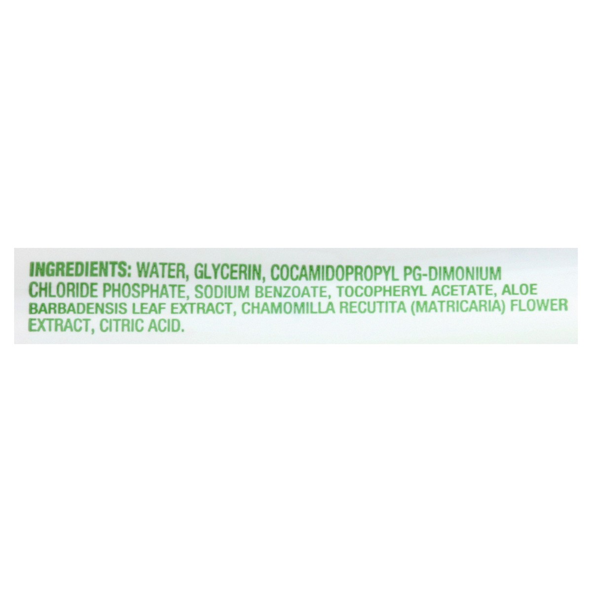 Water, Glycerin, Cocamidopropyl PG-Dimonium Chloride Phosphate, Sodium Benzoate, Tocopheryl Acetate, Aloe Barbadensis Leaf Extract, Chamomilla Recutita (Matricaria) Flower Extract, Citric Acid.