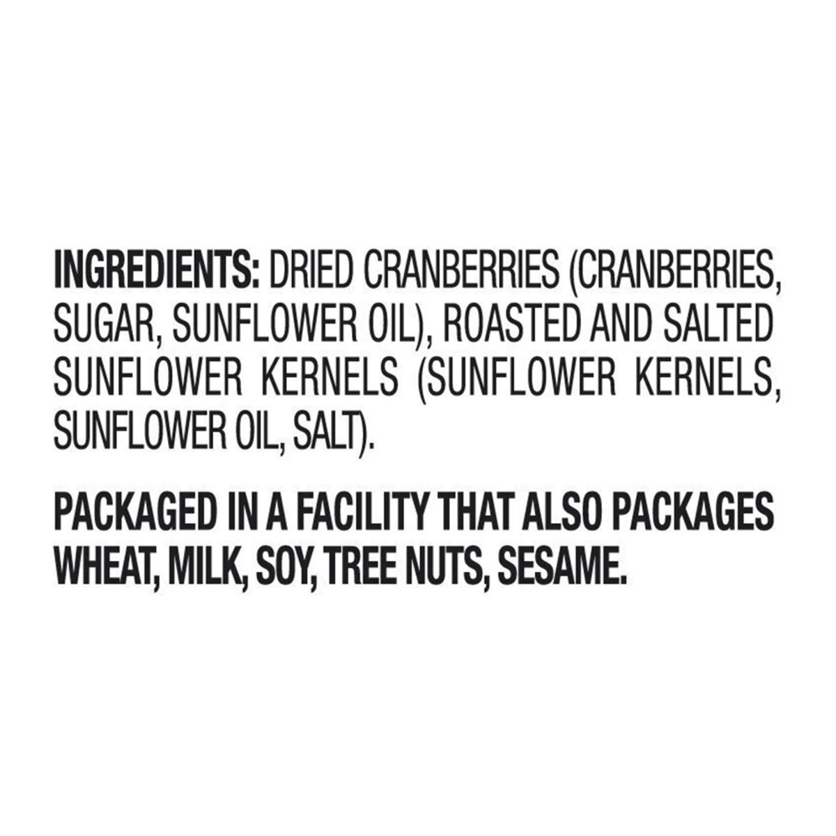 Dried Cranberries (Cranberries, Sugar, Sunflower Oil), Roasted and Salted Sunflower Kernels (Sunflower Kernels, Sunflower Oil, Salt).