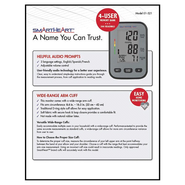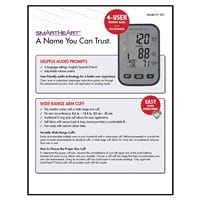 Fully automatic inflation and deflation systolic, diastolic and pulse results. 4person memory bank holds 396readings, 99 per user. Memory recall with datetime stamp, A average of last 3 readings hyper…