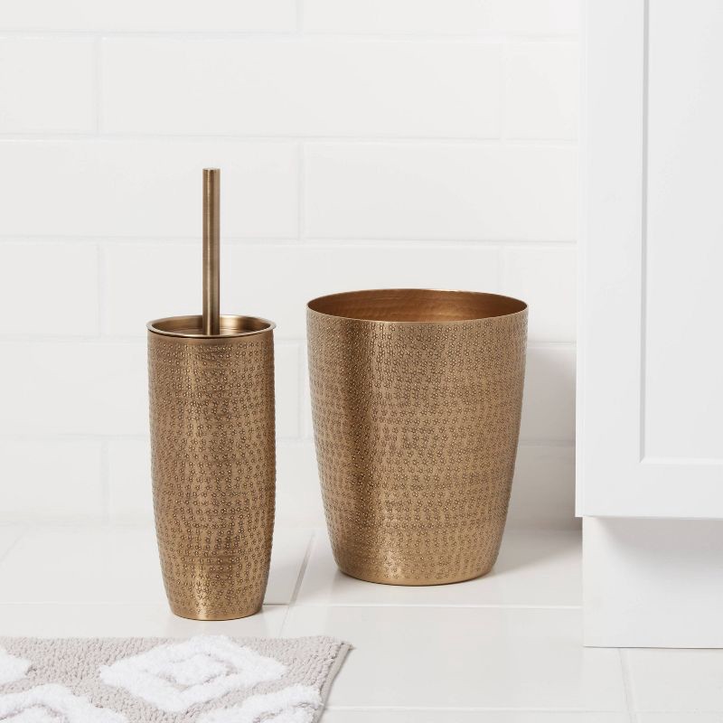 Amp up your bathroom decor while keeping your space clutter-free with this Hammered Metal Waste Can from Threshold™. This aluminum metal waste can features a hammered design to add a sophisticated and…
